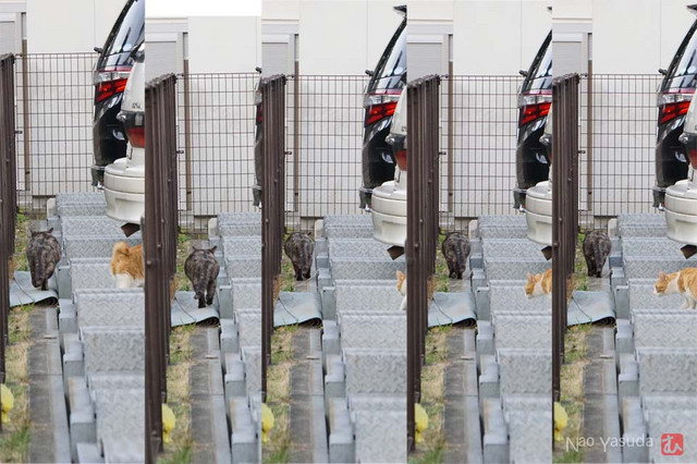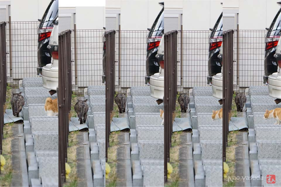 歩き続けるコワモテさんは途中で茶トラさんが来ないことに気がついて待ってあげる。