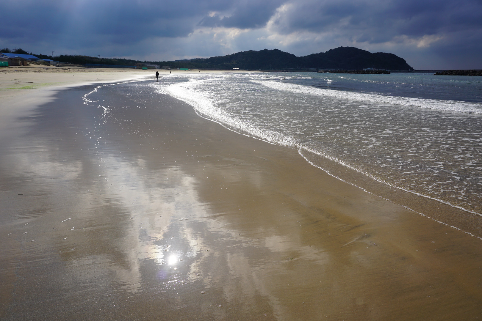 引き潮の海岸に映った雲間から顔をのぞかせた太陽がきれいでした