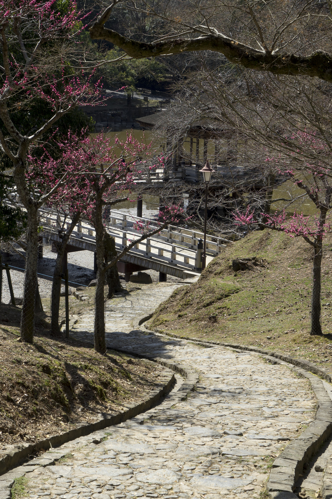 円窓亭から浮見堂に至る道です。なんとなく坂道のカーブが気になって。 隣の片岡梅林は満開で鶯の声でにぎやかですが、こちらは桜が咲くとにぎやかになります。外国語で。。。^^;