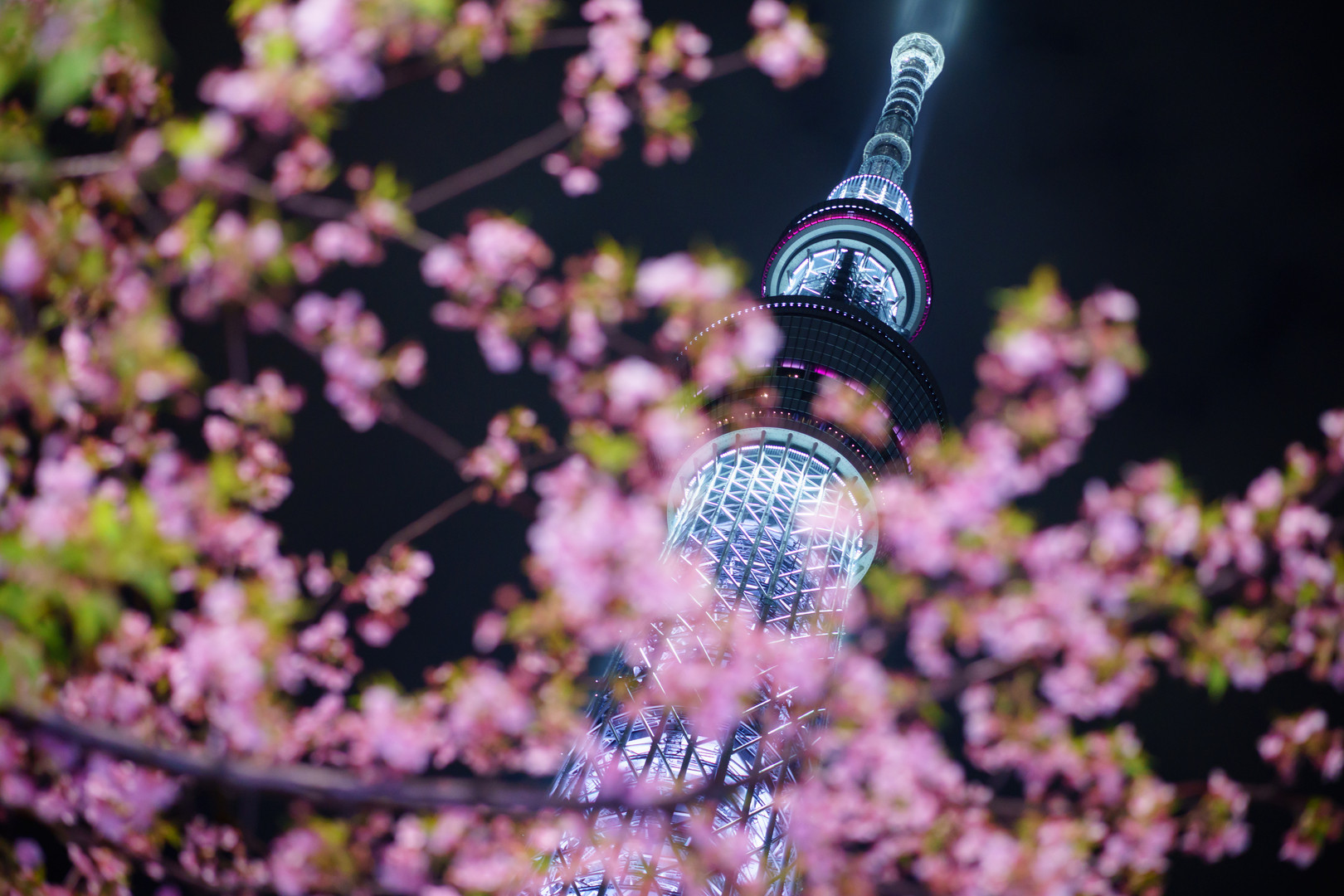 スカイツリーの麓に咲いた河津桜と一緒に夜のスカイツリーを撮って参りました。