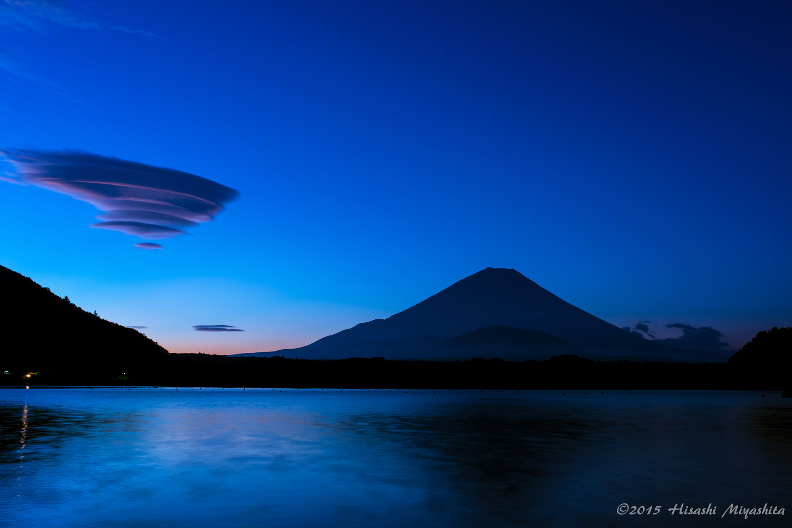初秋の精進湖の朝、富士山に難南西の風があたり東北東に吊るし雲が現れ消えました