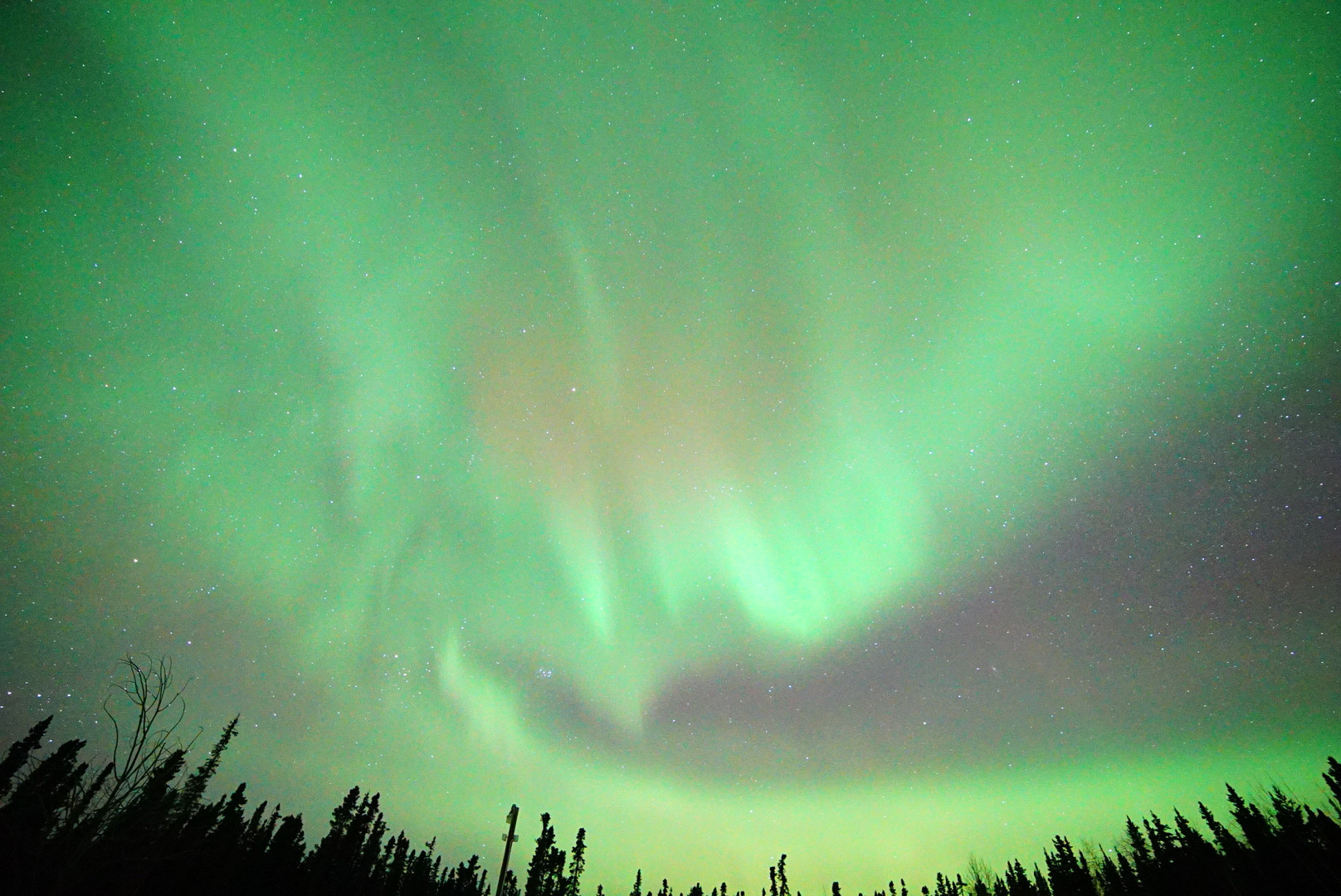 翌日には、ゆらゆらと全天をあかりがうごめいていました。あかりが降りかかる前には、狼が盛んに遠吠えをして教えてくれました。フェアバンクス郊外の「NorthernSkyLodge」にて撮影しました。