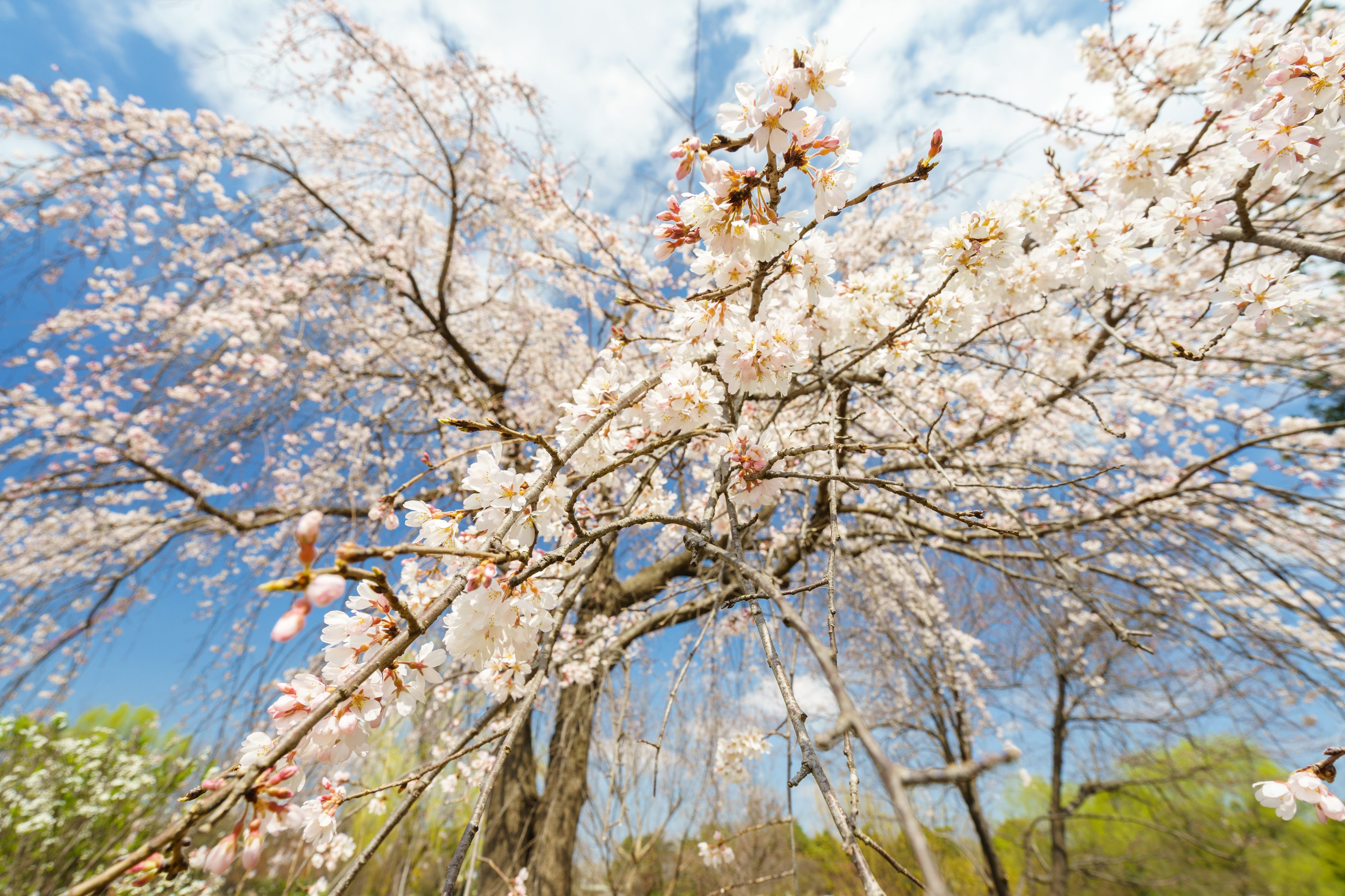 昭和記念公園の枝垂れ桜です。 鳥が翼を広げてるように見えませんか?