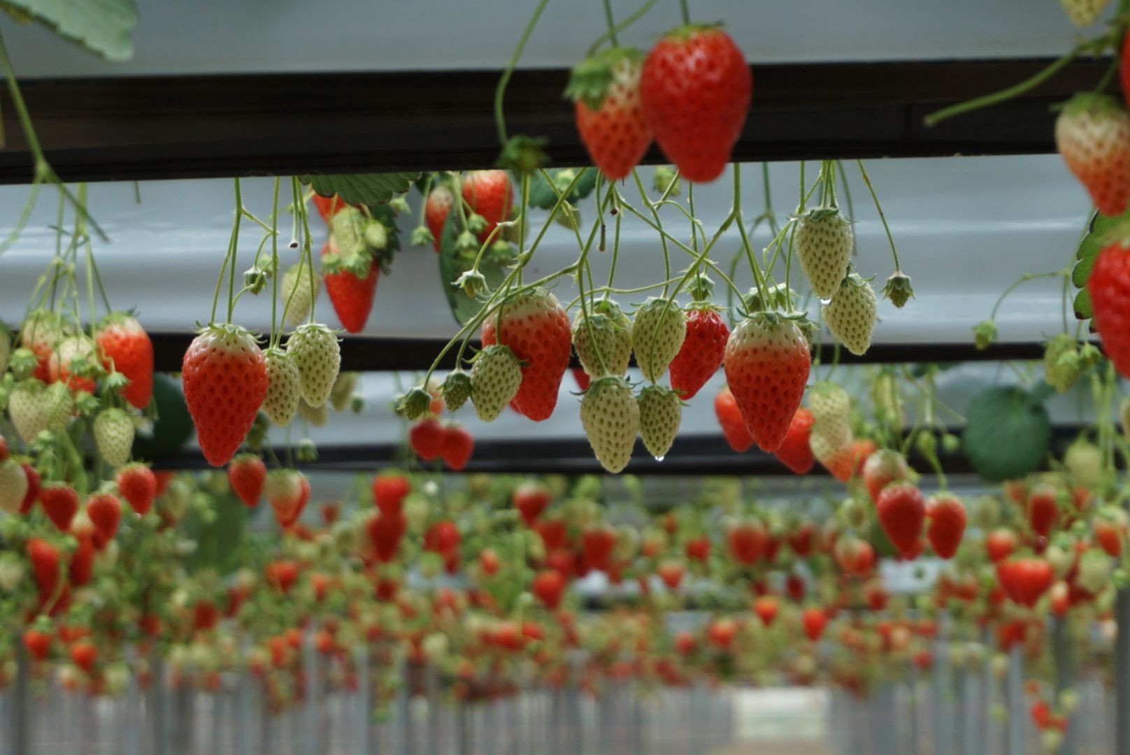 いちご狩り。 顔を上げるとカーテンのように苺がたくさん。