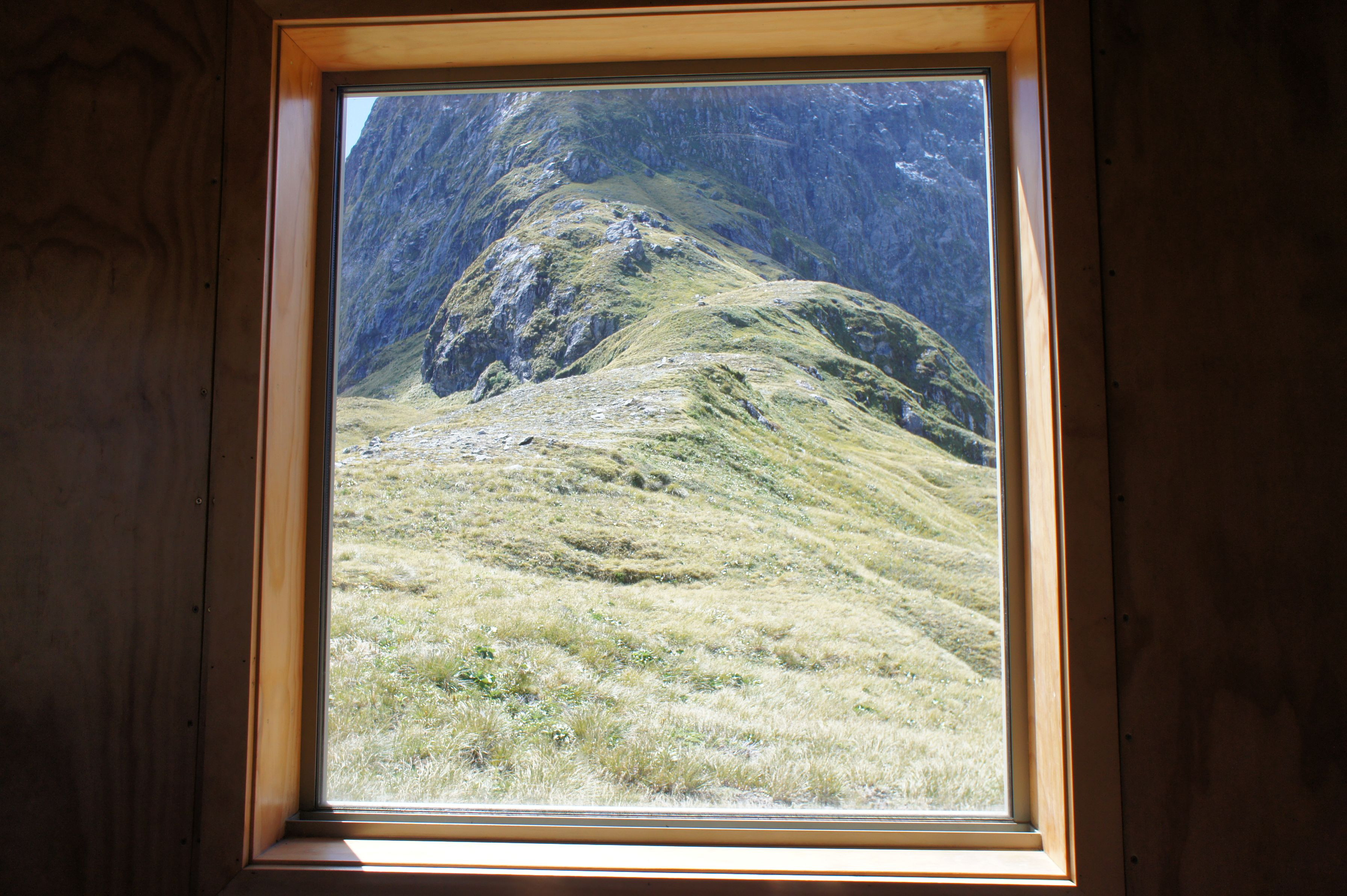 天気の良い昼間、山小屋の窓枠がちょうど額縁のようになり、奥の景色が絵画のように見えました。羊とかいればもっと良かったなぁ。 撮影スポットはニュージーランド南島