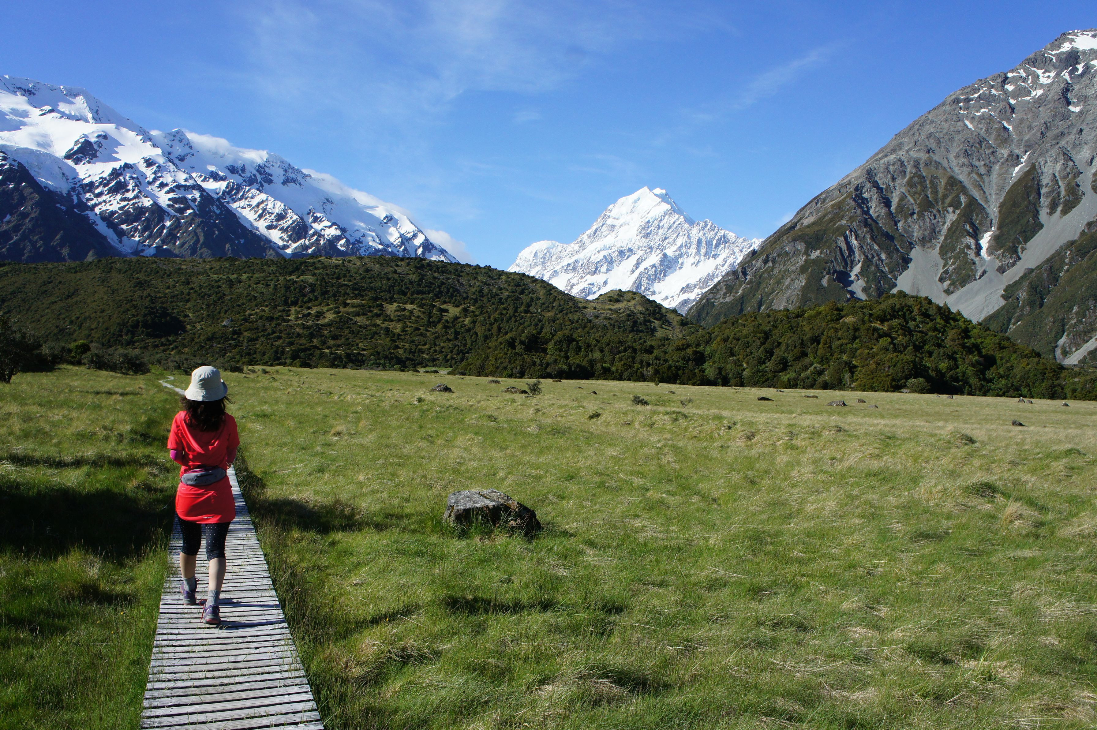 ニュージーランド最高峰Mt.クック周辺のトレッキング。 フッカーバレー湖へ続く道はよく整備され、自然環境を守るため所々に木道が設置してある。 草の緑・空の青・行きと氷河の白、そしてたまたま着ていた派手な赤色のウェアがいいアクセントになった。