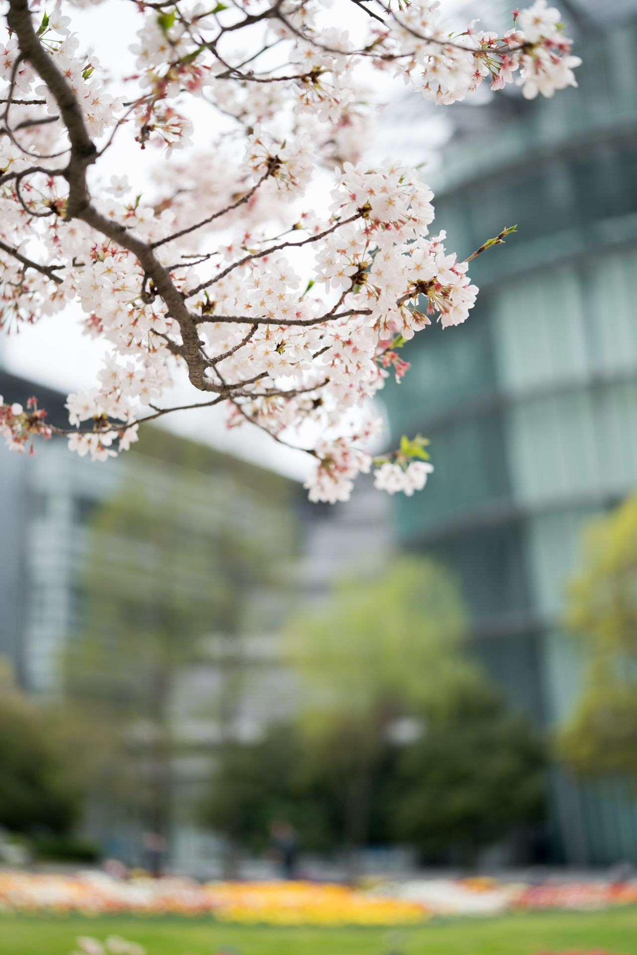 サクラの下から色とりどりのチューリップを眺める