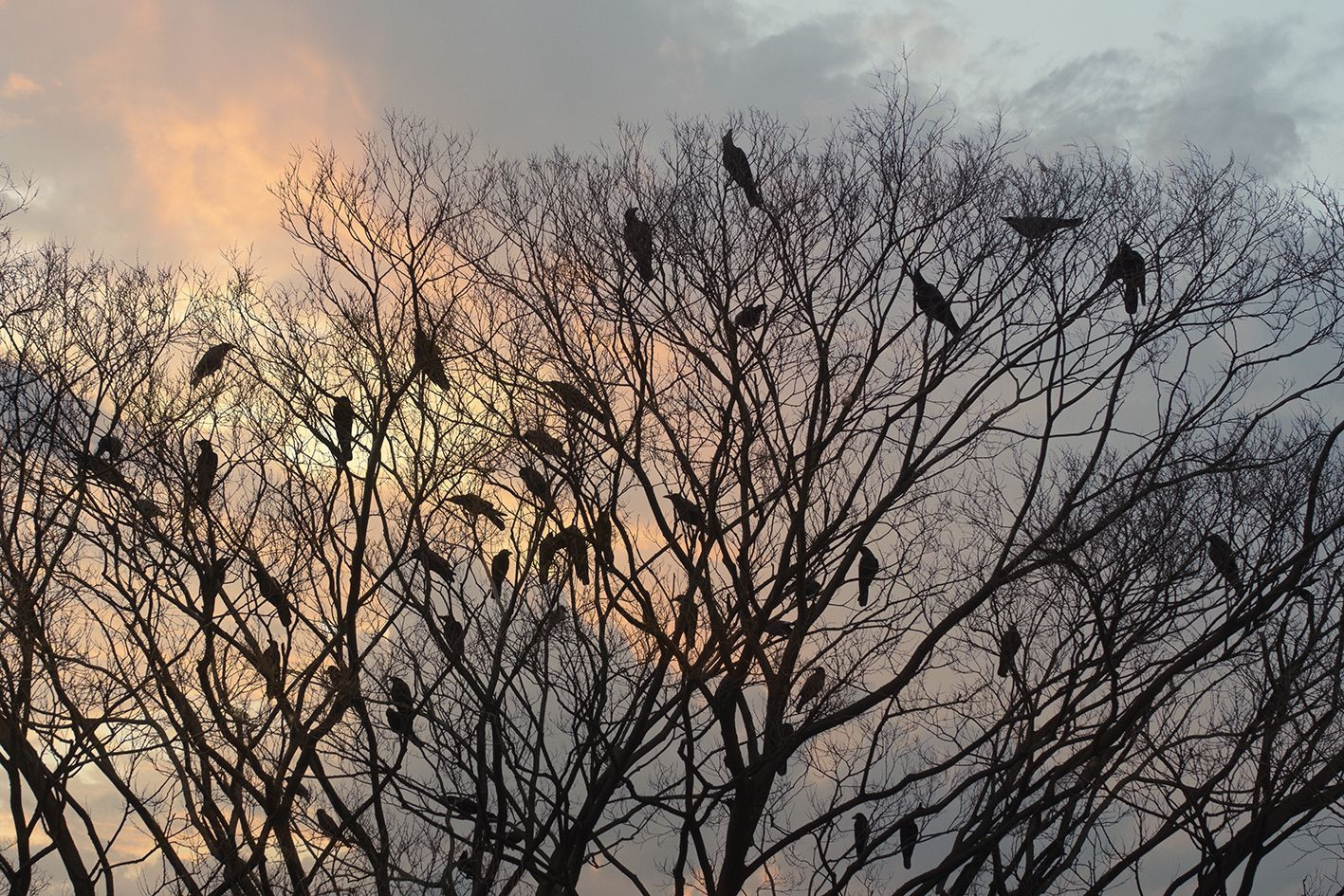 夕焼けにカラスの群れ