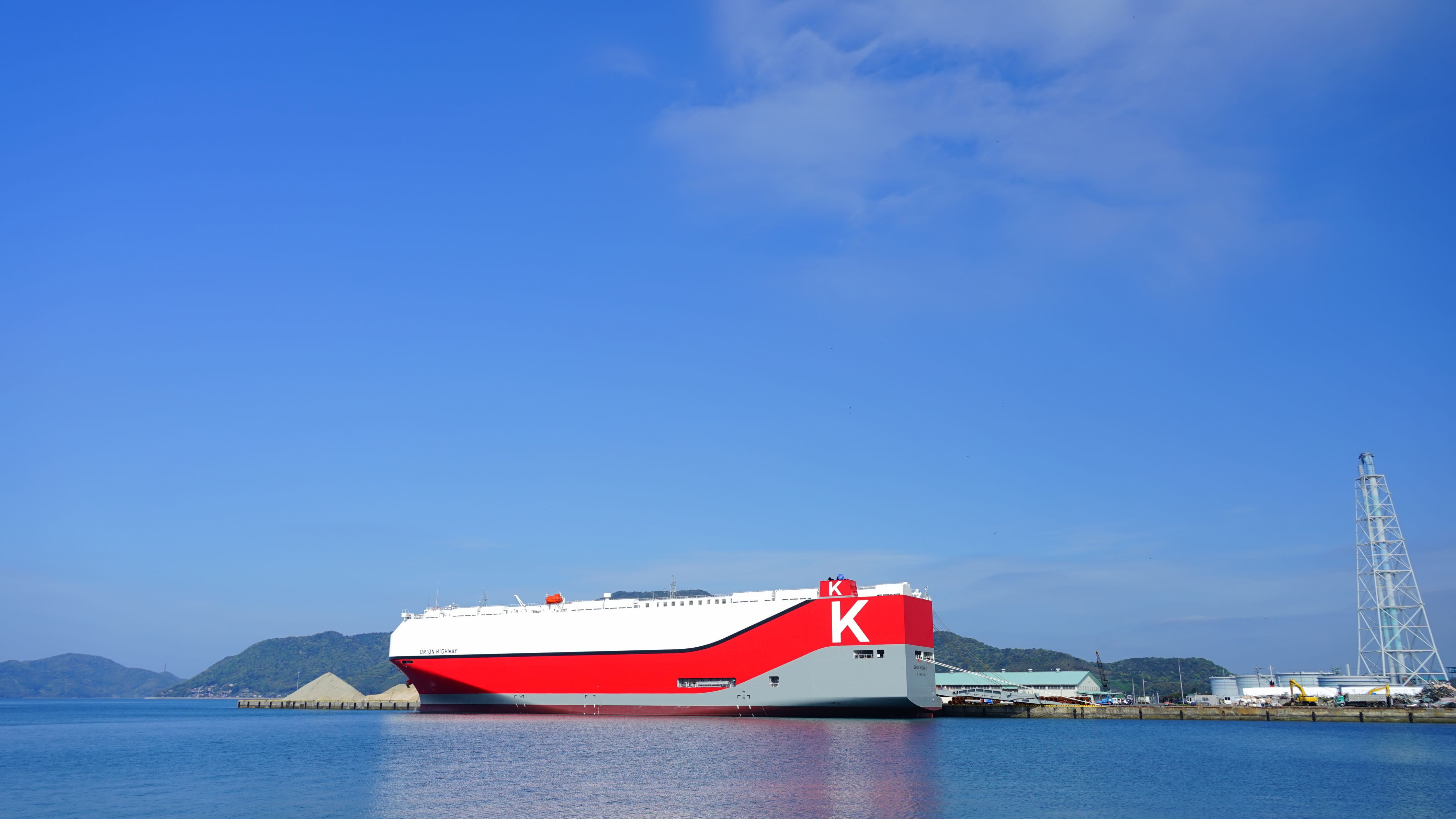 イギリスに電車を運搬するために、田舎の港に巨大な船が入港していました。 右下に白いシートを被っているのが、積み出される電車です。