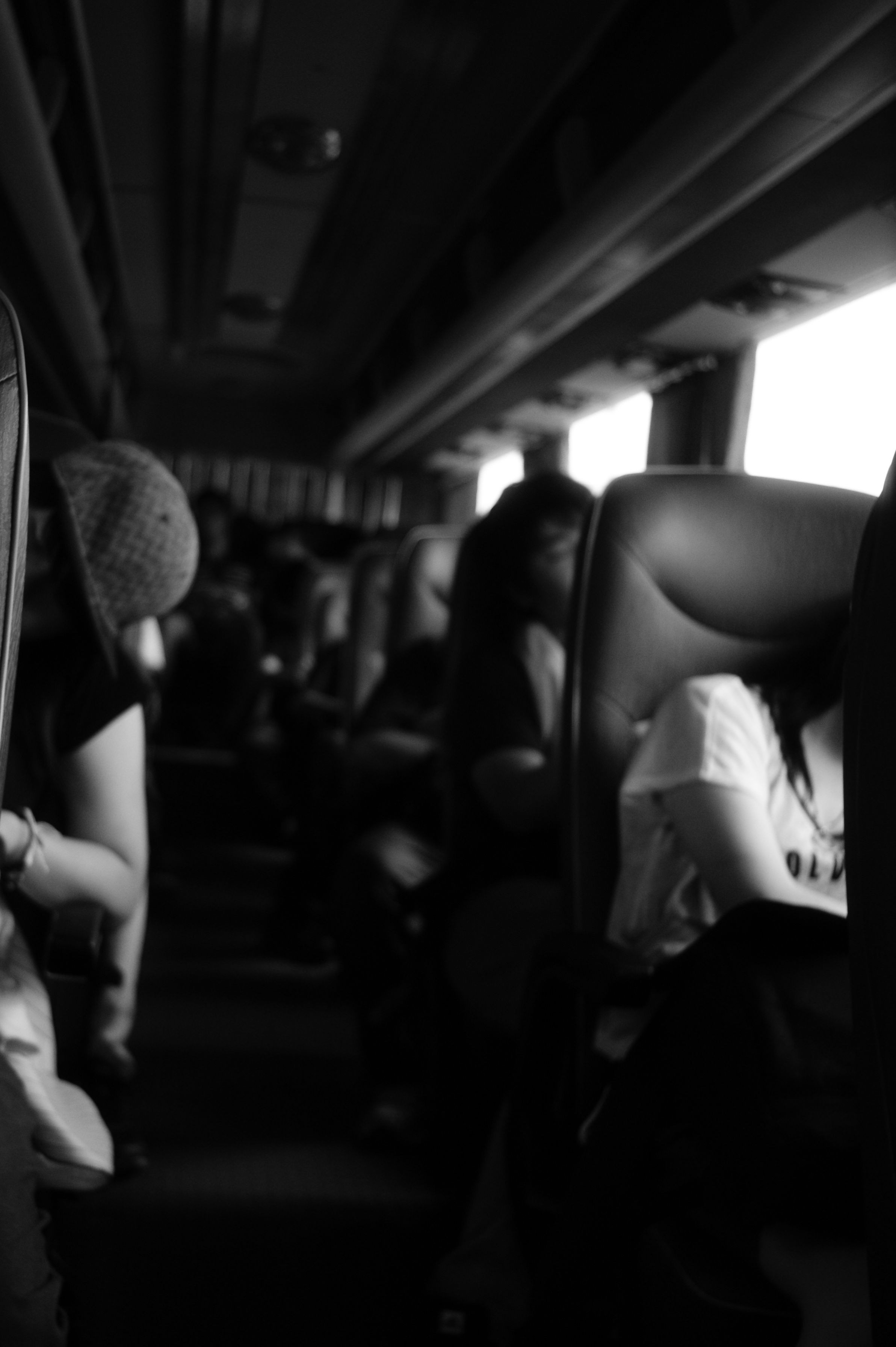 旅行先でへとへとのバス車内。顔も出さず眠っているぎりぎりの表現かと。