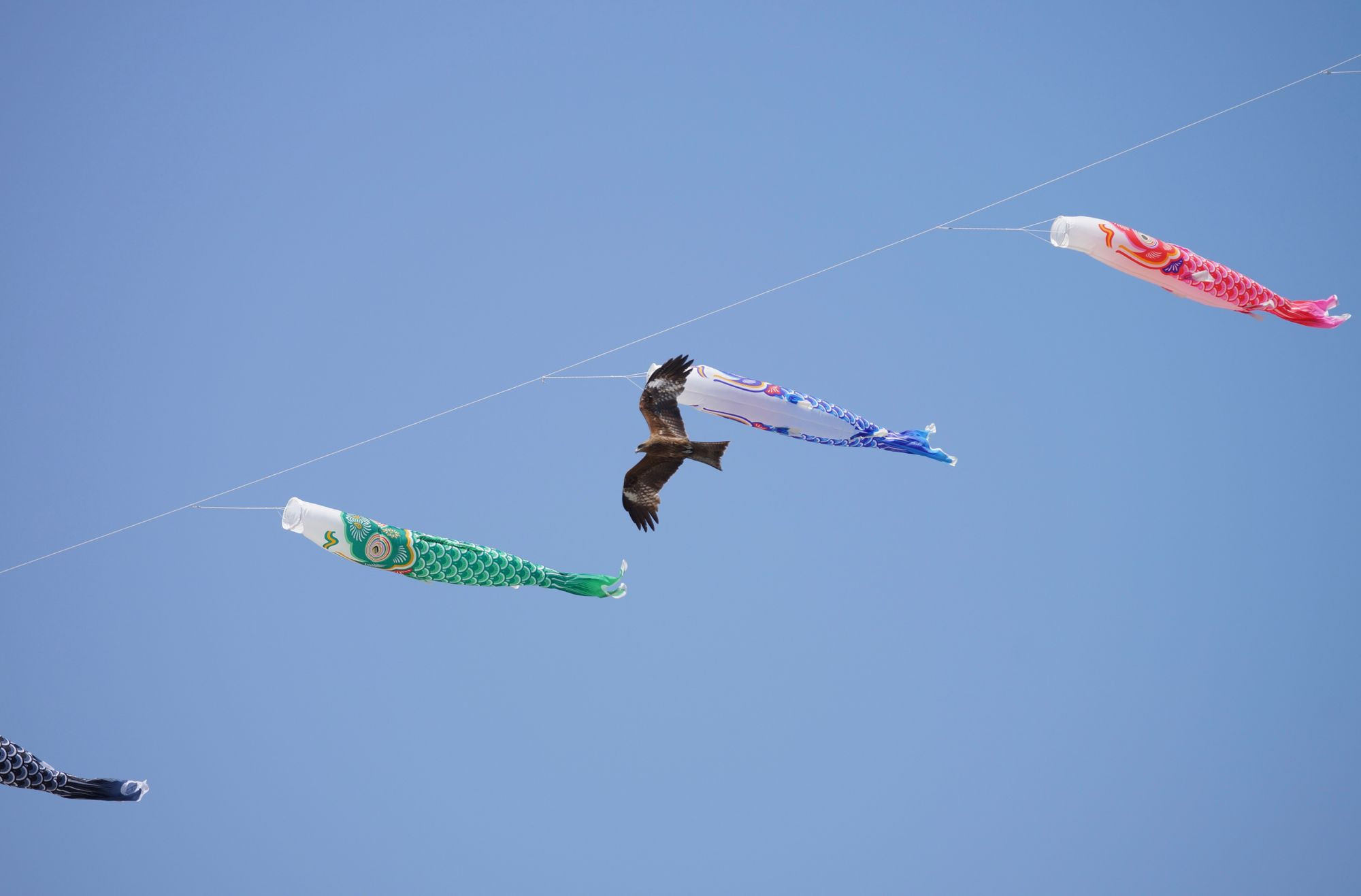 こどもの日。 凧揚げ大会で、大凧が鯉のぼりを快晴の大空へ。 トンビは恐れることなく、付近を徘徊しておりました。 ちょっとピン甘いですが、珍しいシーンなので(^^;
