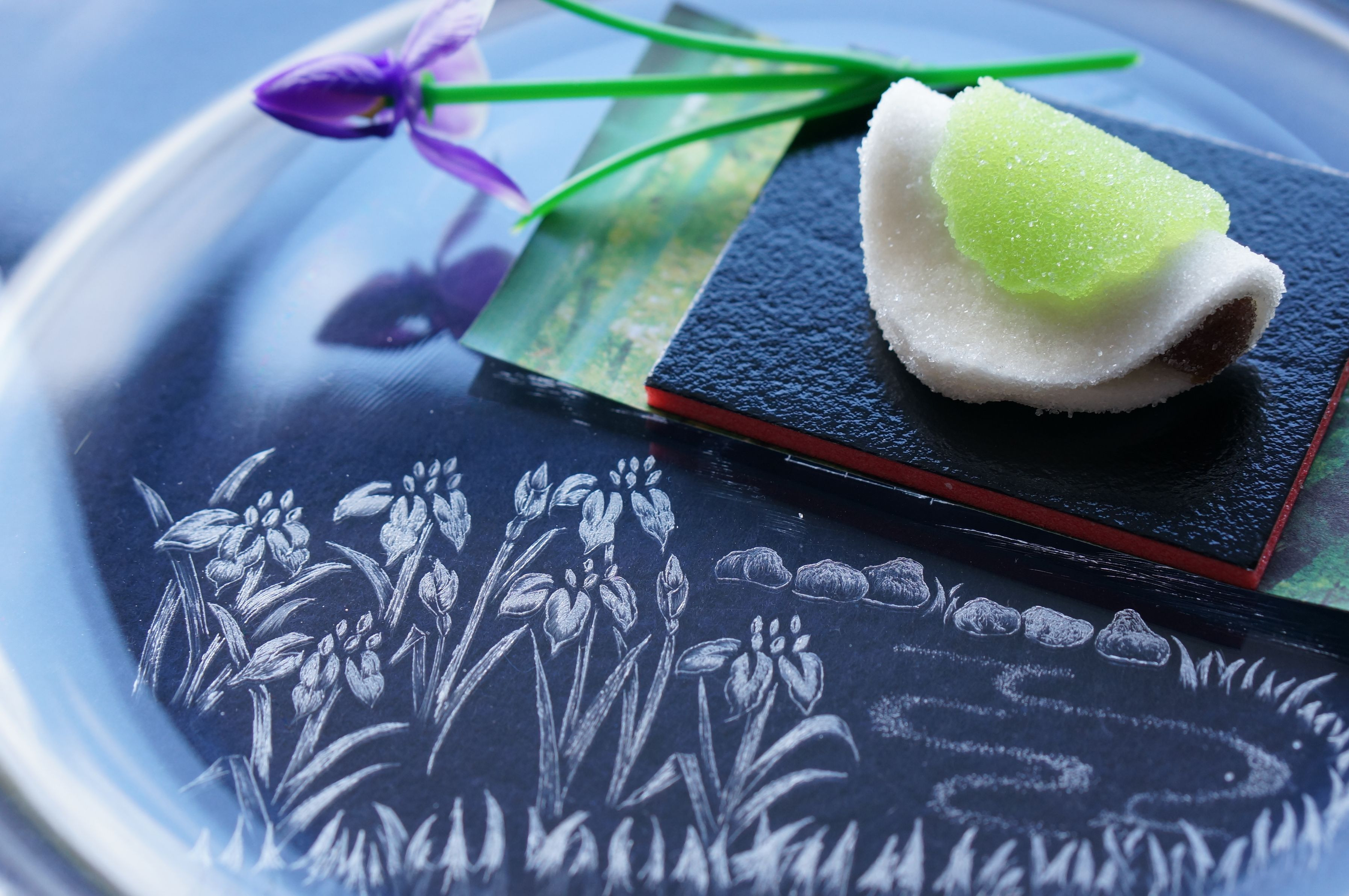 たくましく・お健やかなかご成長をお祈り申し上げます(^^)/ 柏もちの形の生和菓子です^^。とても美味しくいただきました。 ※ガラス皿に菖蒲を彫りました。