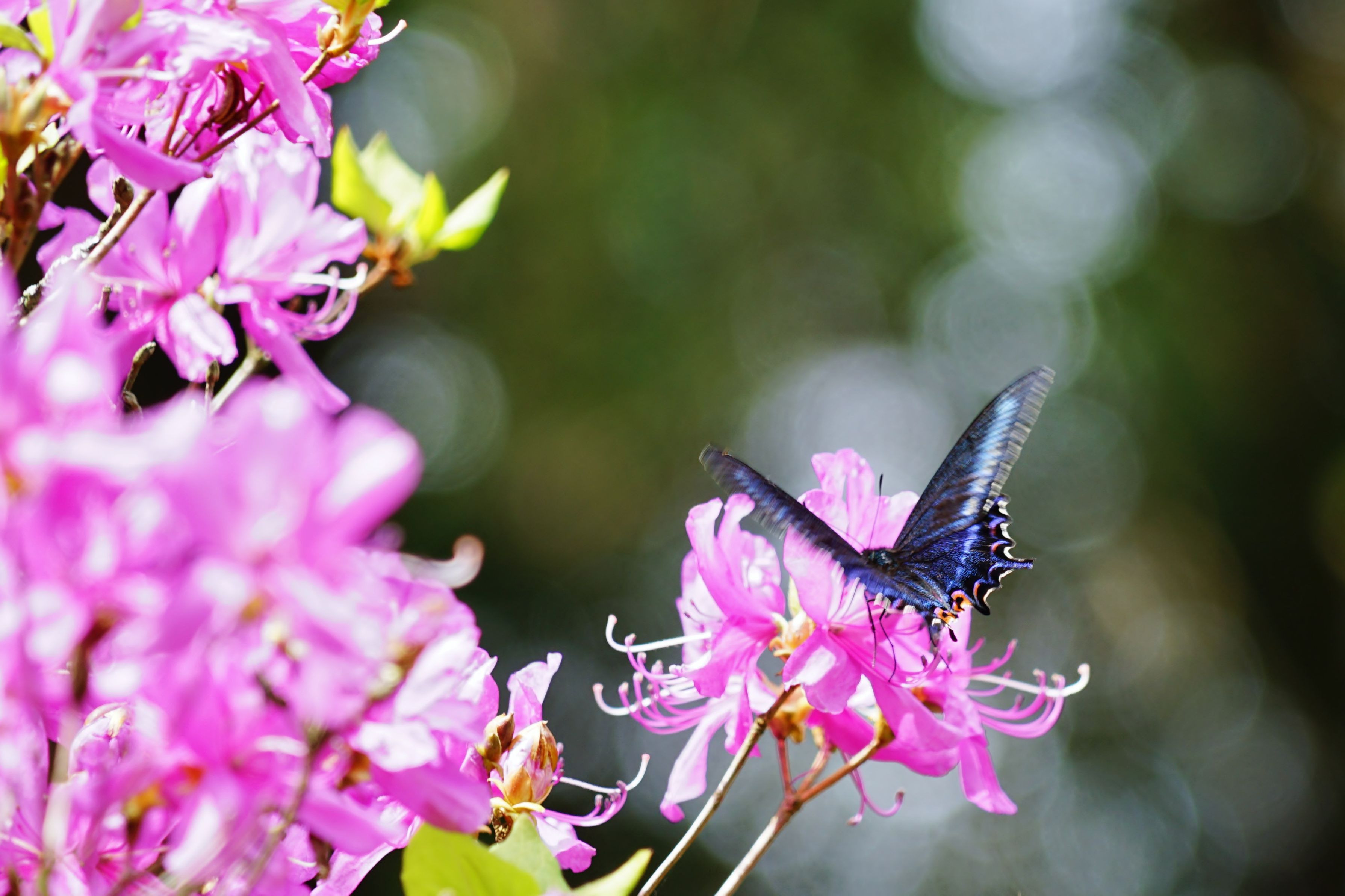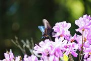 カラスアゲハでしょうか!? 翅が青く輝き、とても綺麗な蝶でした✨ ピンぼけでお恥ずかしい写真ですが、初めて撮影できましたので(v.v*) (トリミングしてます)