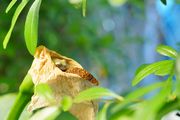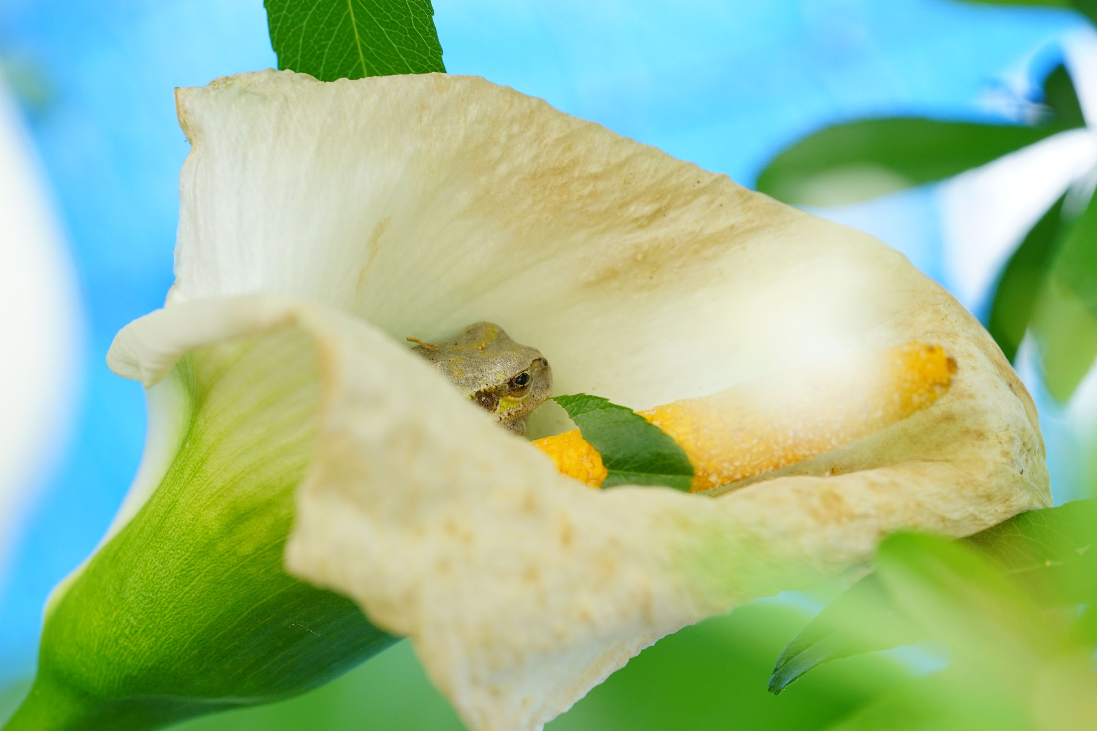 このカエル君は、カラーの花の中がお好き。 花が色あせ、枯れてきても・・・。 今日は、1日中まどろんでいました。