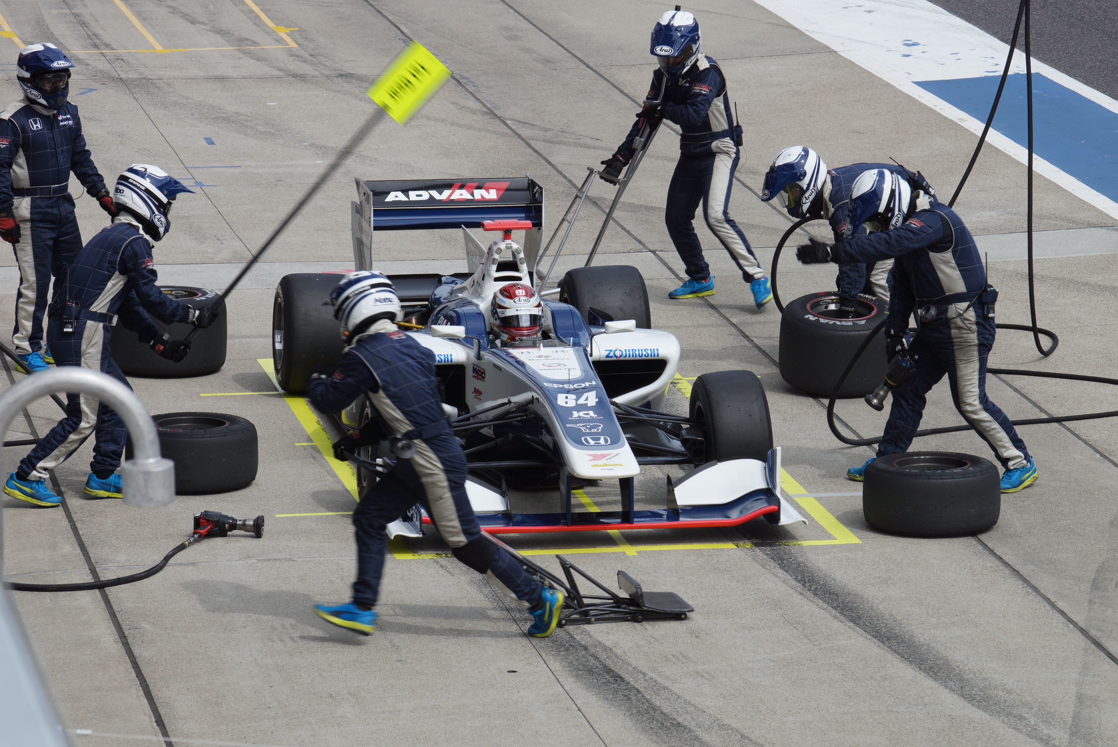 スーパーフォーミュラ、2016年開幕戦。タイヤ交換を終えてピットアウト。