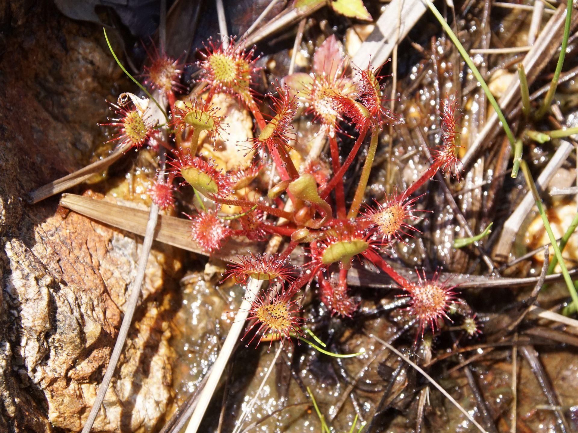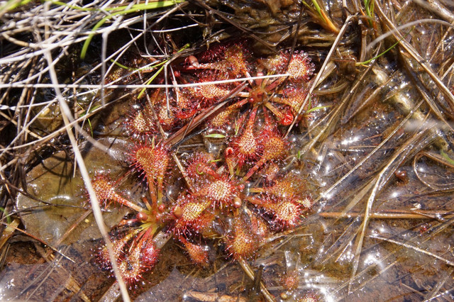 トウカイモウセンゴケとモウセンゴケ、初めて見ました。 ここでは両方自生しています。 テレビでは良く見るのですが、結構小さいんですね。 花が見たいですが、あと2ヶ月ほど後でした。 両者は花の色が違います。
