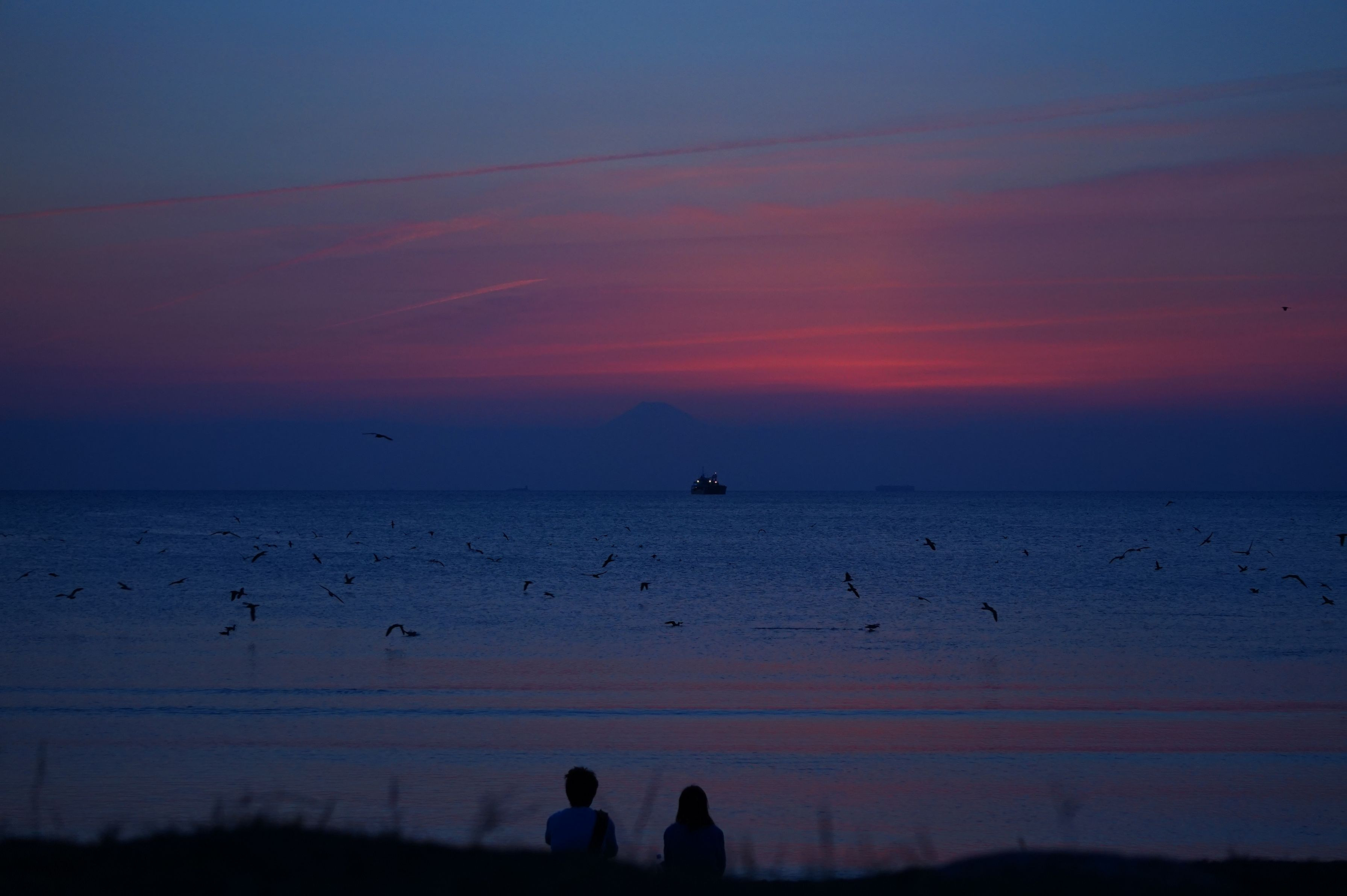 夕焼けをバックに語り合う二人を撮ってみました。
