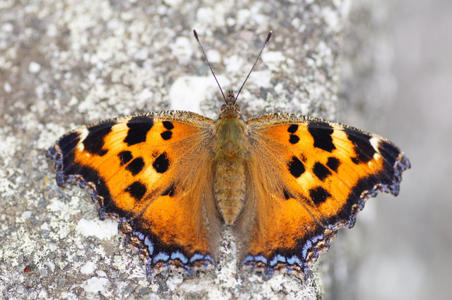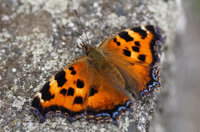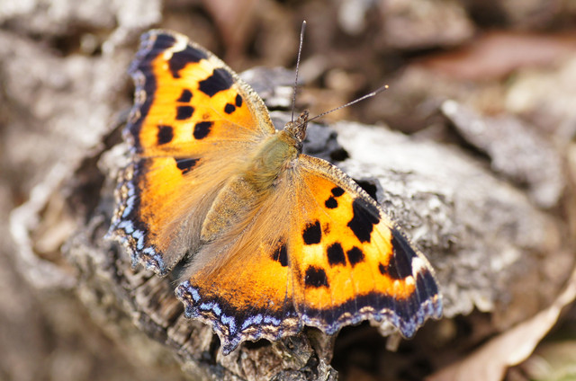 樹皮そっくりの翅を開くと鮮やかな色彩を誇るヒオドシチョウ。この鮮やかさは越冬明けにはほとんど失われてしまいます。