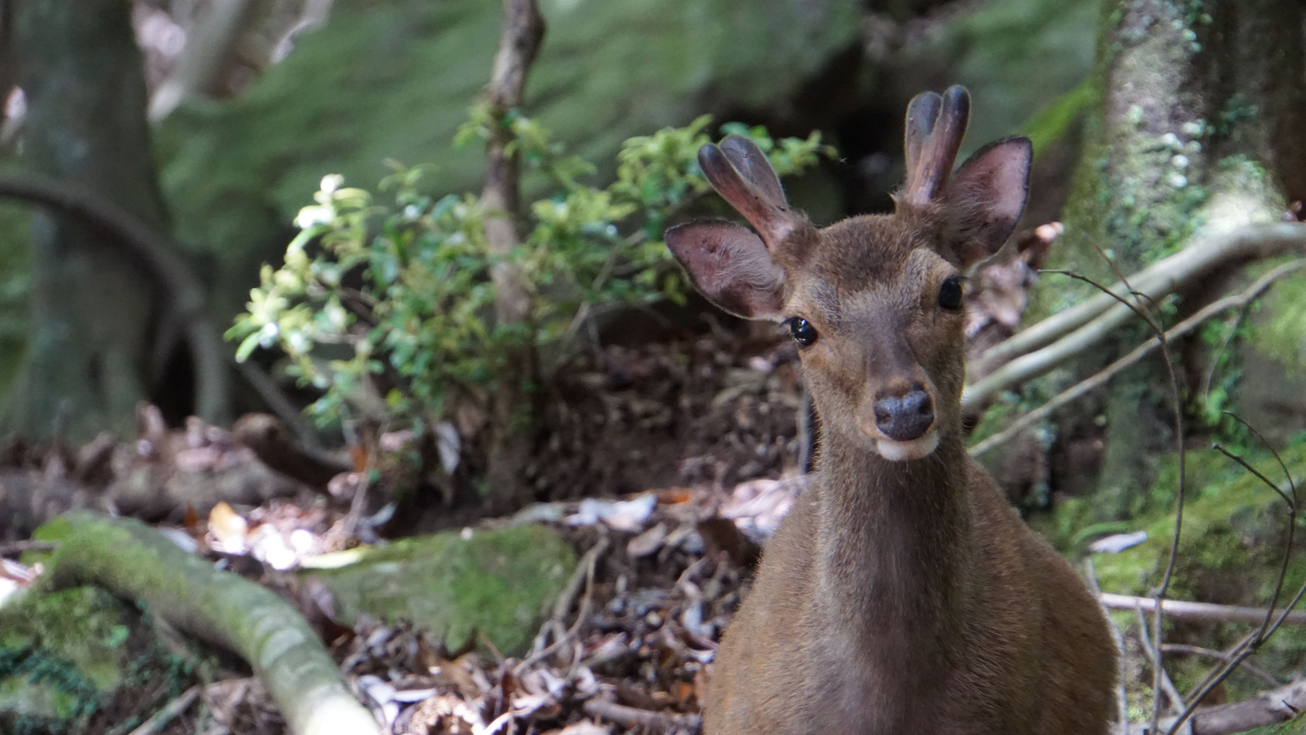 林道沿いで出会ったヤクシカが、餌を食べるのをやめて興味深そうにこちらを見ていました。