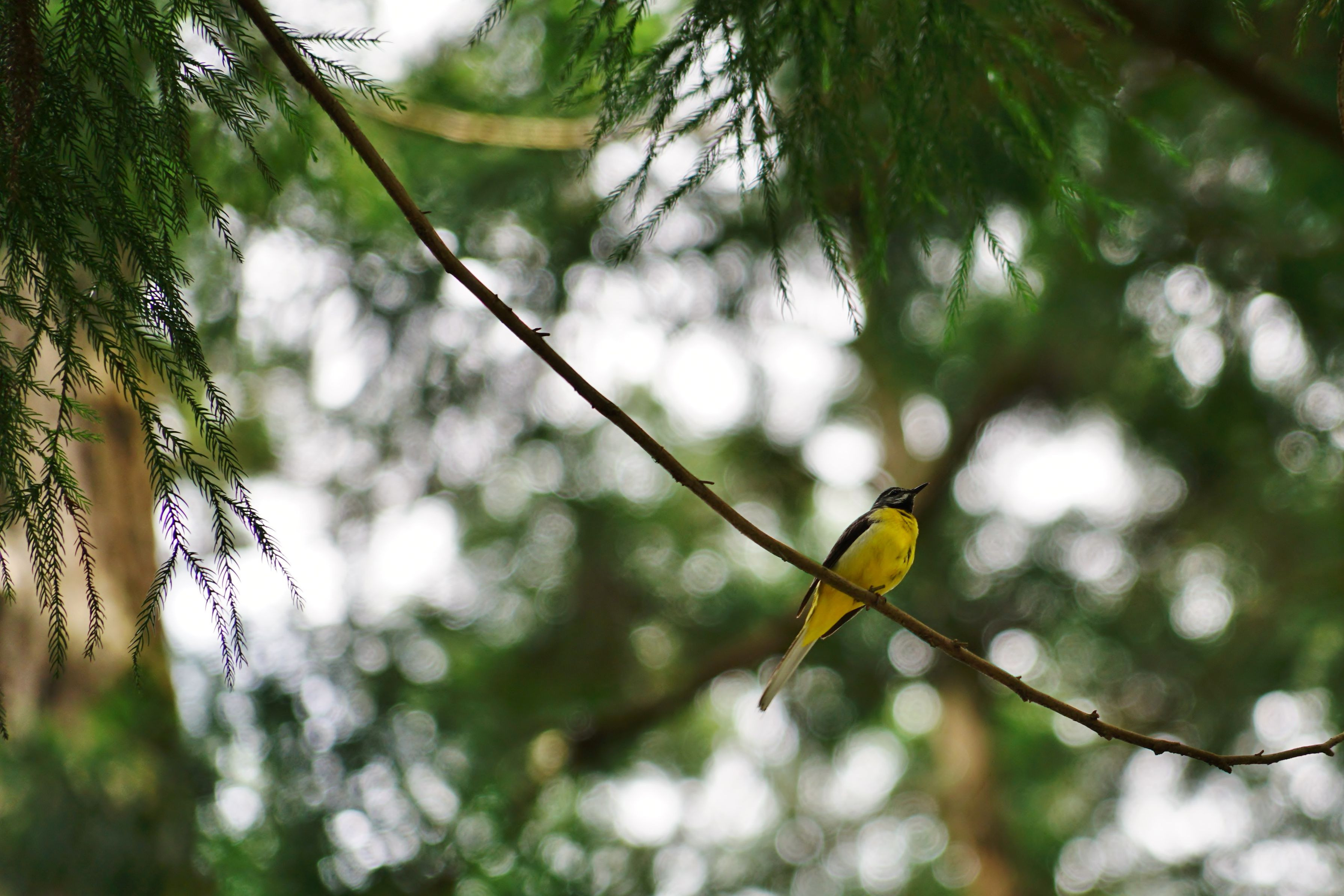 キセキレイさんかしら!? これまで水辺で見掛ける事が多かったのですが 高い枝にいたので見上げる感じで撮りました(^_^;) (トリミングしてます)