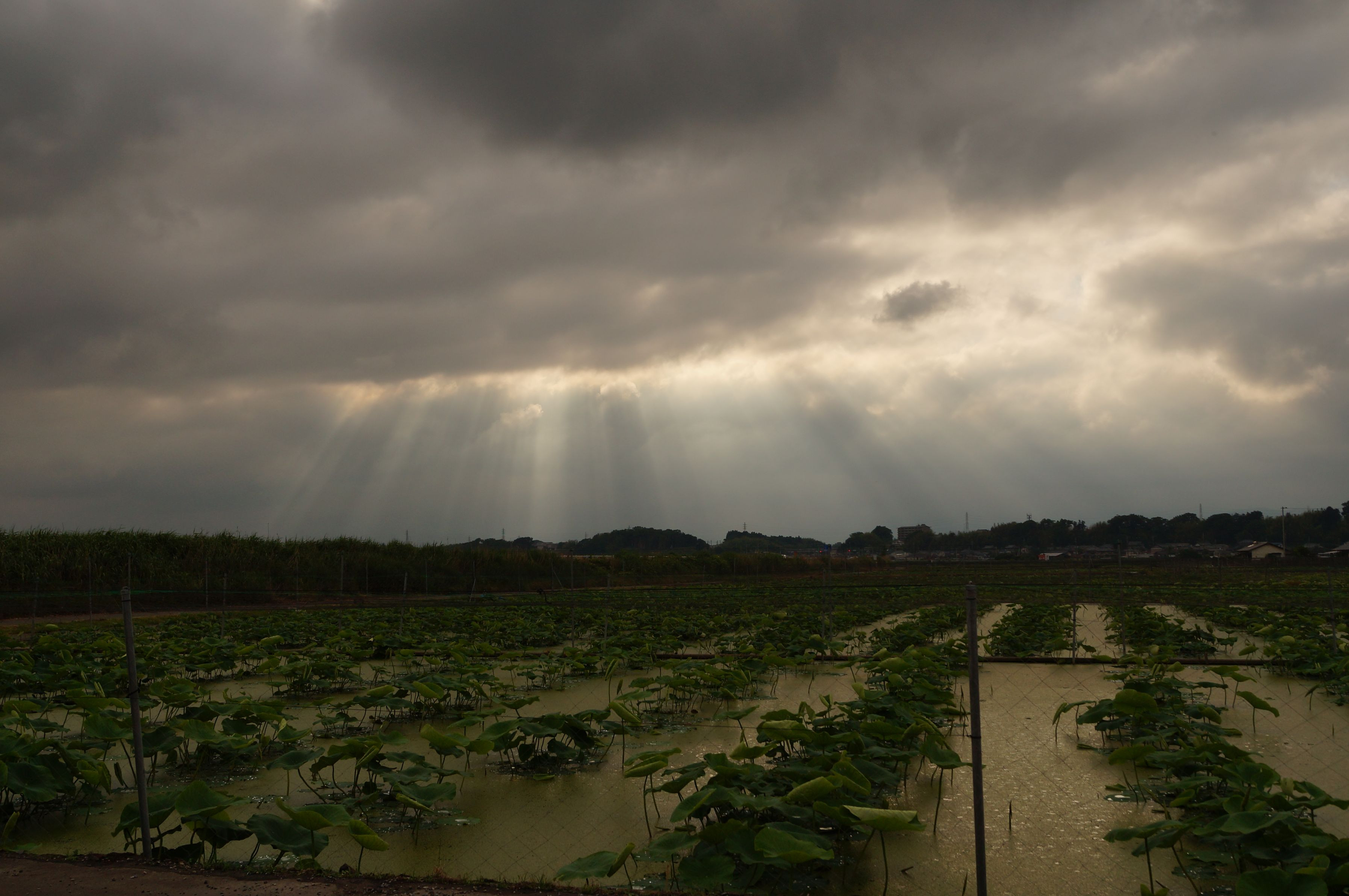 ハス畑の向こうに、光が差す空。