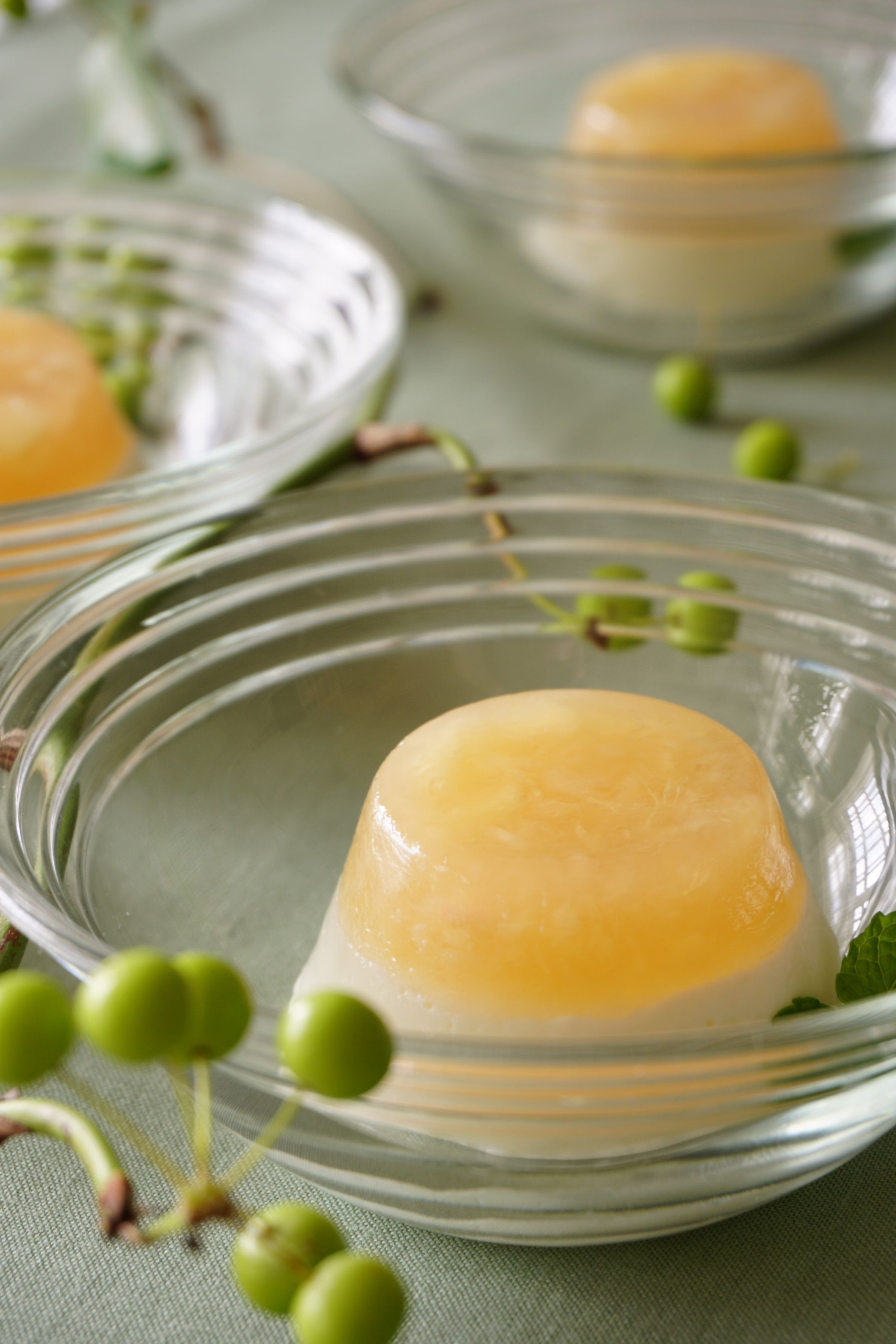 M嬢より 桃のデザートのリクエスト 頂きました。 桃を ぐしゅぐしゅ潰して ゼリーにし その上にヨーグルトゼリーを重ねて・・ 誰にでも できる簡単 さっぱりデザートに仕上げました。 (実は 暑すぎて 煮焚きするのを省略、楽チンなのが1番!)
