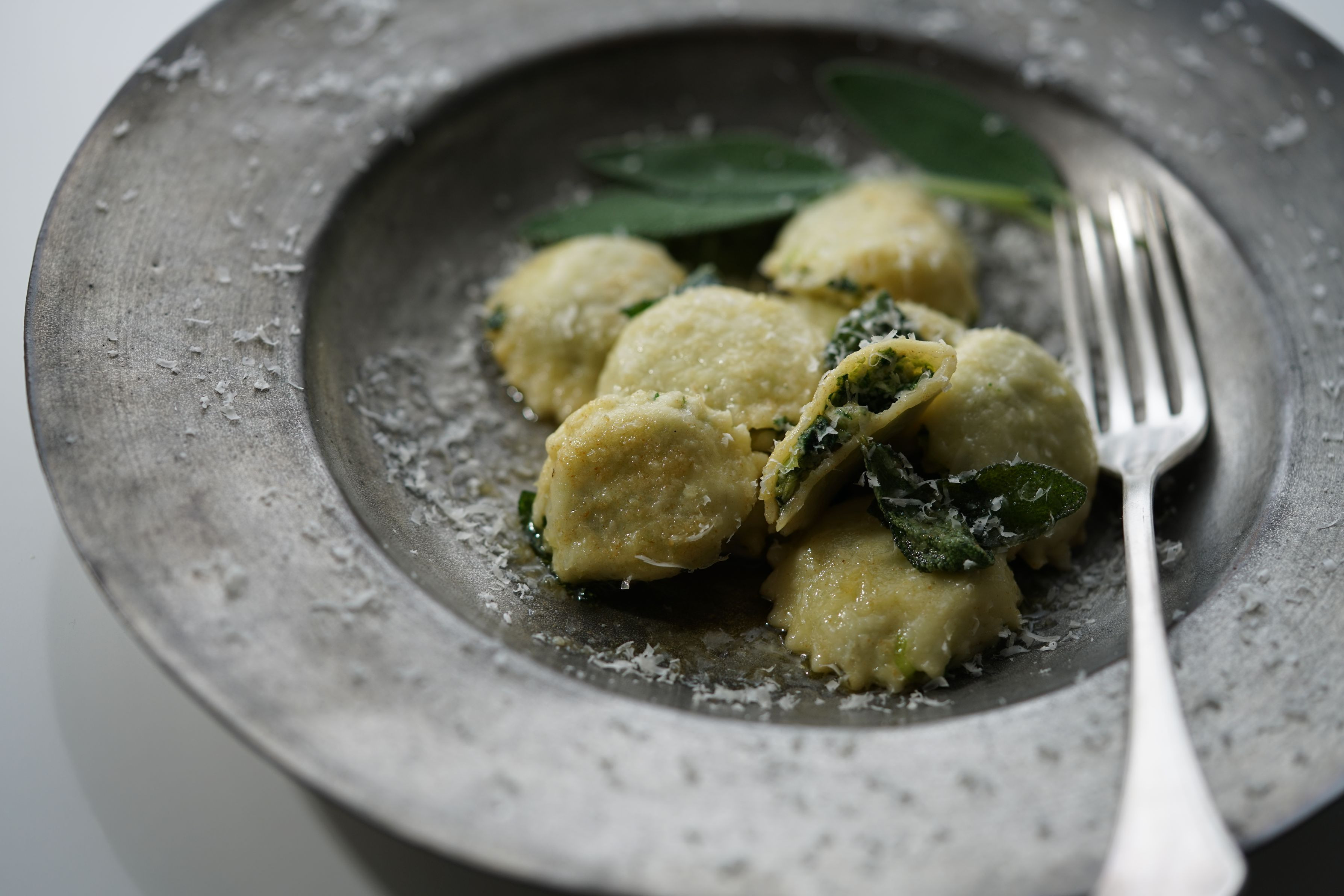以前作った手打ちパスタです。ほうれん草とリコッタチーズのラビオリ、セージのバターソース。美味しいんだけど、面倒なのでたまにしか作りません。銀彩のパスタ皿に盛り付けました。