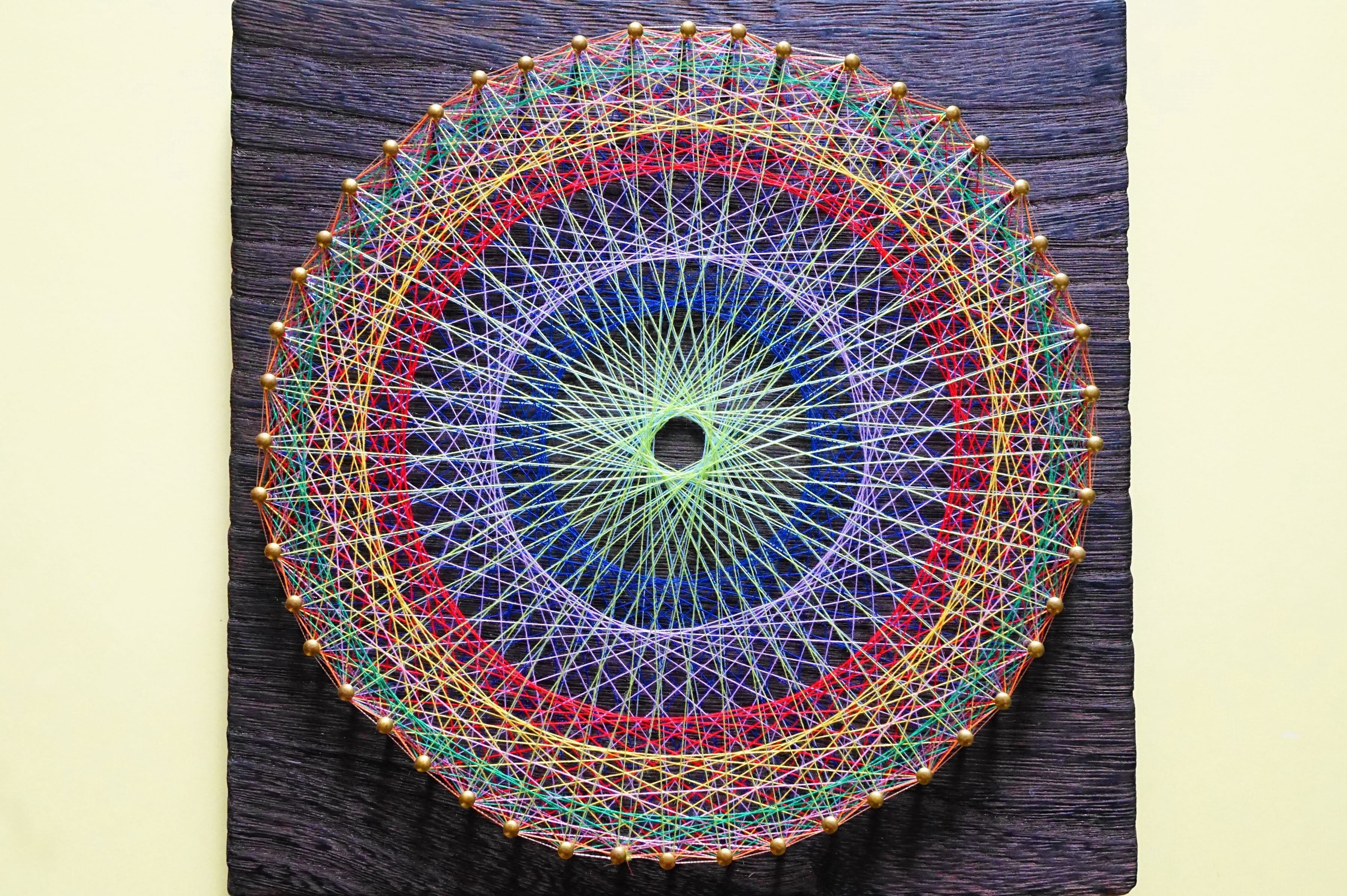 生協の講座で「糸掛け曼荼羅」を習ってきました。 板に釘を打つところから初めて、決められた素数ごとに糸を掛けていきます。 どの色の糸を使うか考えたり、間違えないように数を数えるのが忙しかったけれど、日常を忘れて無心になれて、とても楽しく作ることができました。(^○^)