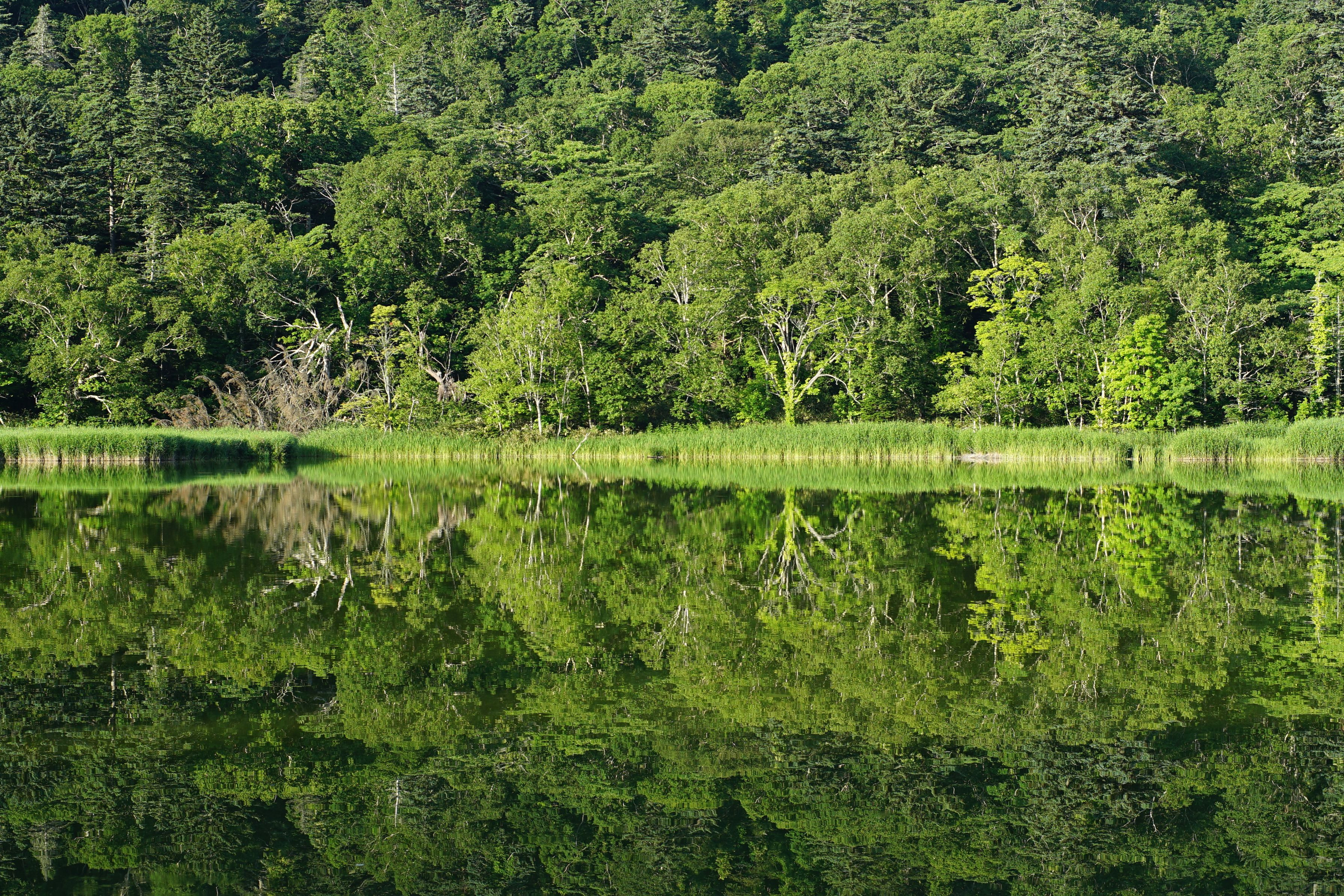 利尻島の姫沼です。 湖面に映った森が上下反転しても違和感のないような見事な線対称でした。