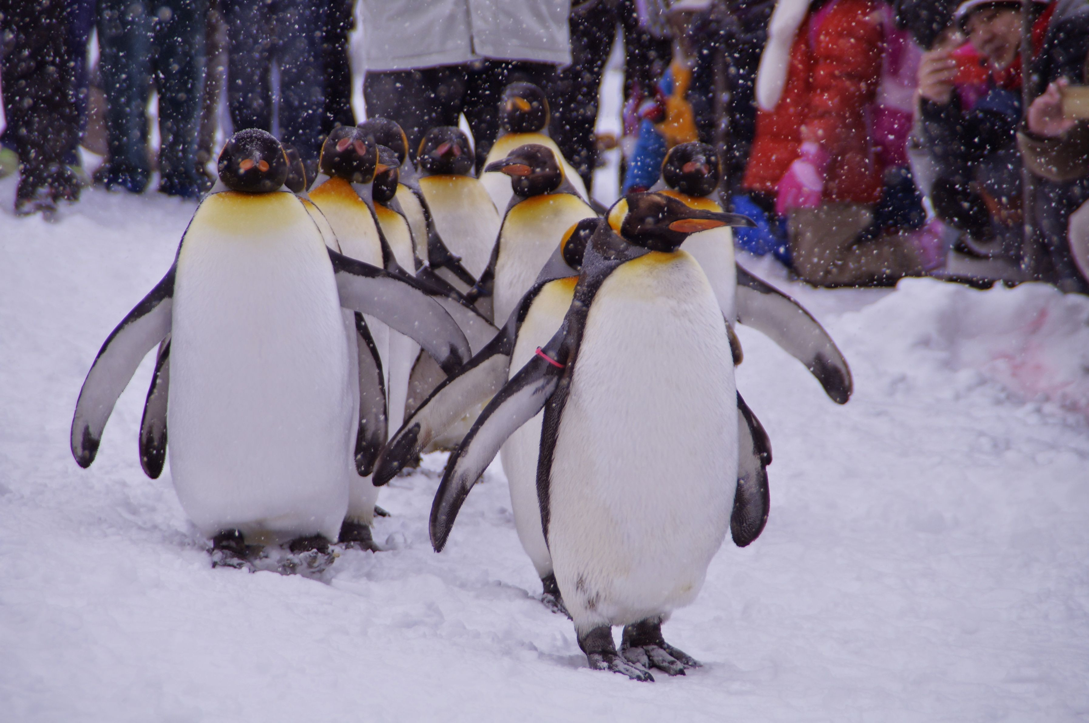 旭山動物園にて 始まる30分位前から場所取りしてました。 100m位の列が出来てました。 数十m先を歩いてたときなので、実際にはほとんど見えず。 雪のなかのレンズ交換は怖かったです
