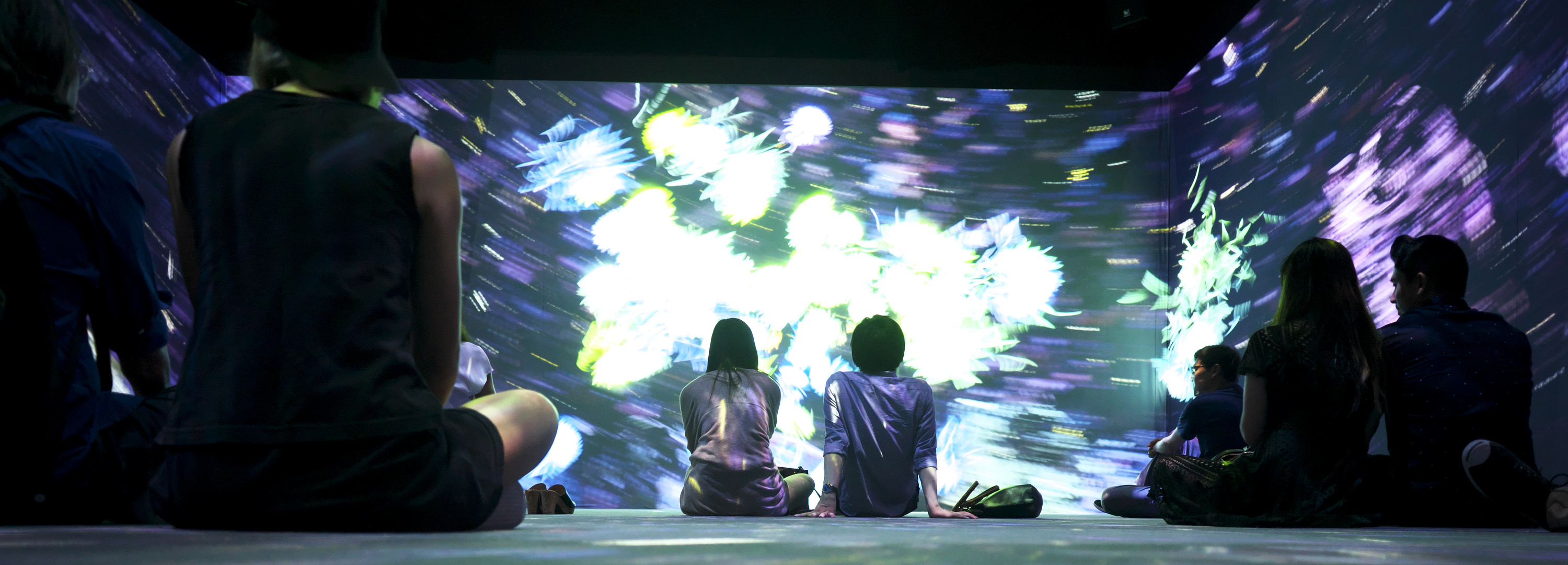 六本木ヒルズ 森美術館 「宇宙と芸術展」より チームラボ 《追われるカラス、追うカラスも追われるカラス、そして衝突して咲いていく - Light in Space》