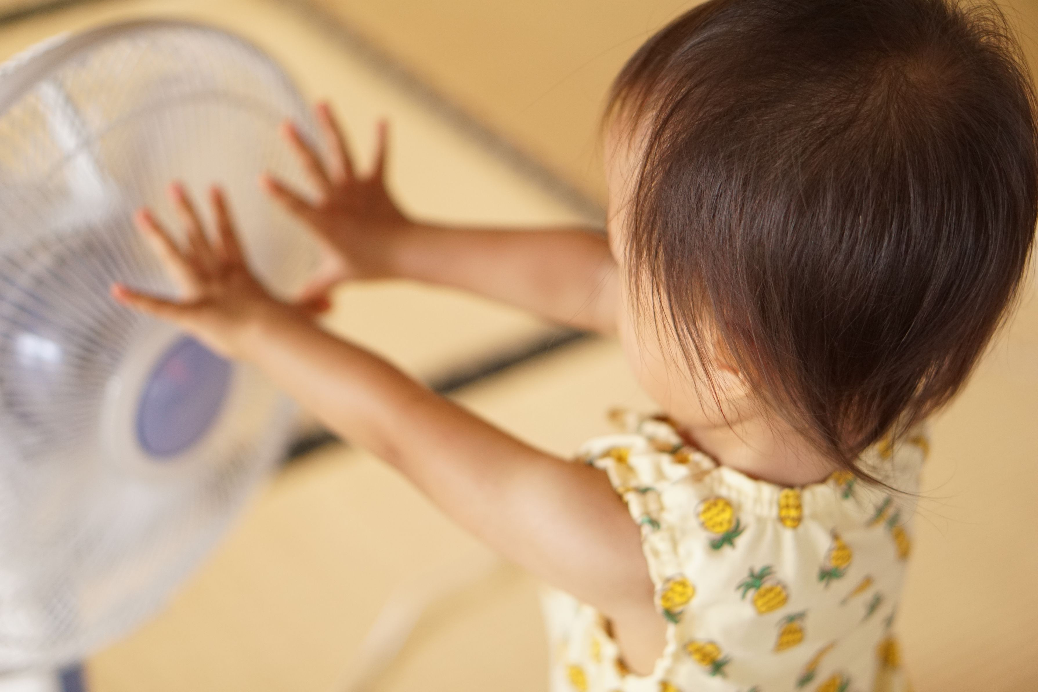 娘(1歳)のひいおじいちゃんの家で撮った1枚! 扇風機に手を伸ばし涼んでいました✧‧˚