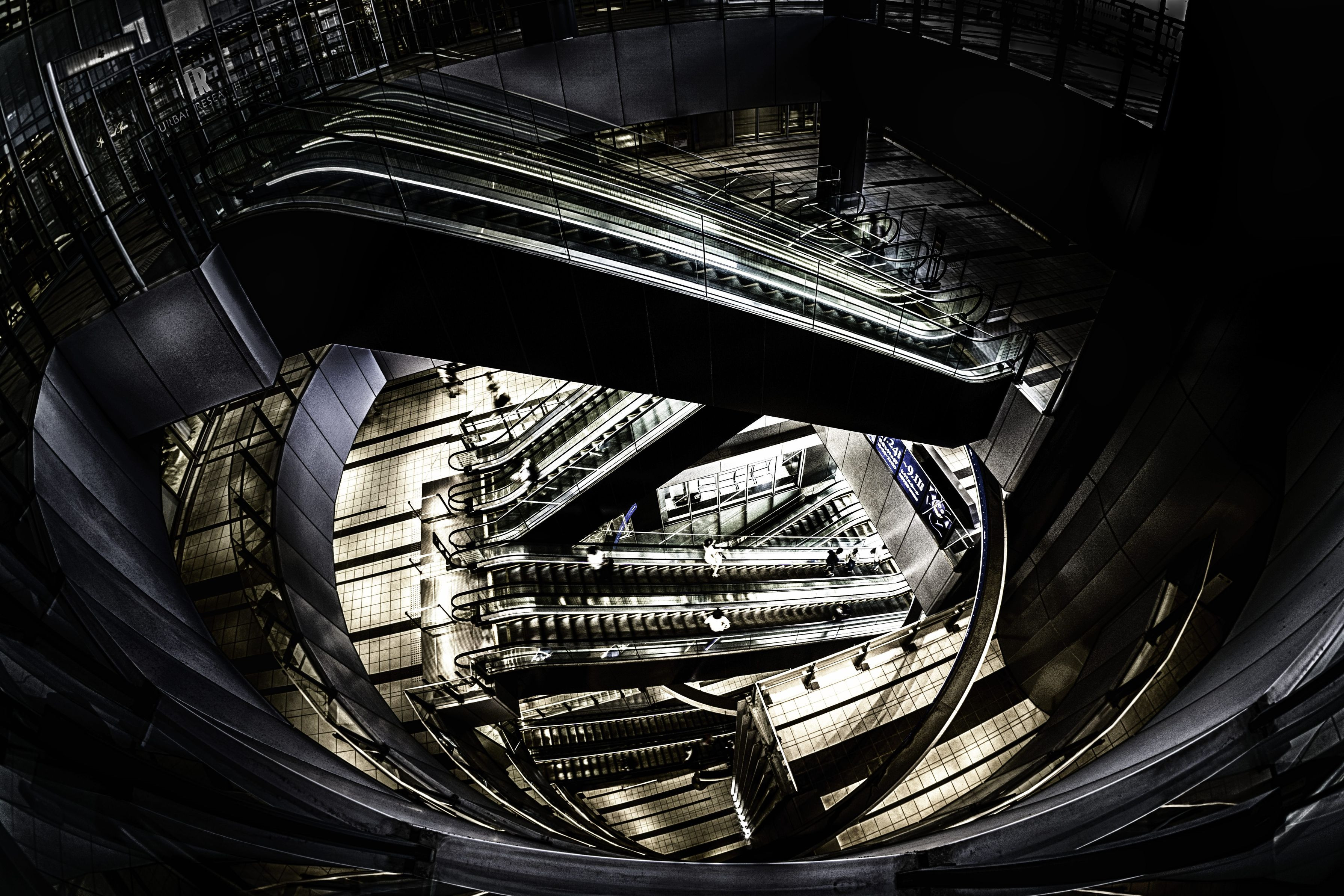渋谷 ヒカリエのエスカレーターホールにて撮影。 Lightroomにて調整後、HDR化しています。 フィッシュアイコンバーター(VCL-ECF2)使用。