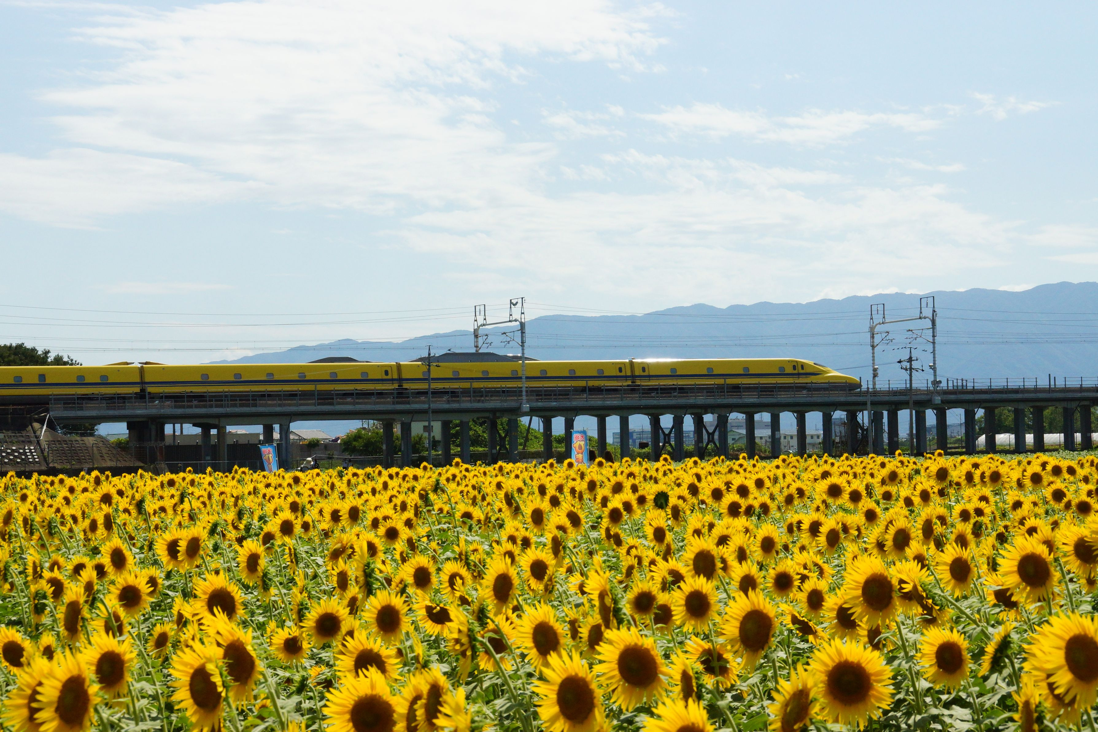新幹線の黄色とヒマワリの黄色のコラボ 夏ならではの光景です。