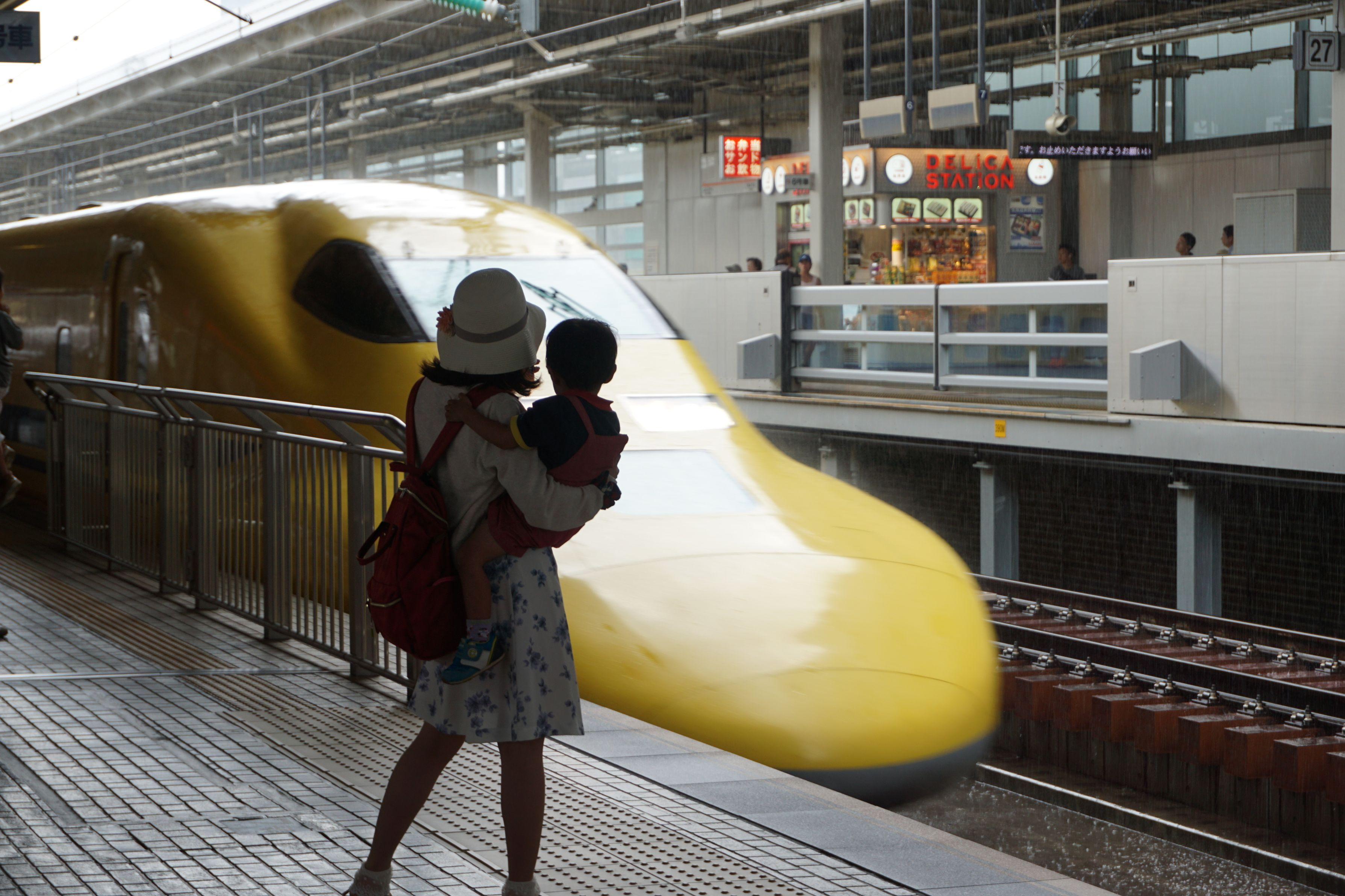 夏休み終盤、親子連れが多い新大阪駅での1枚 黄色い新幹線を見て喜ぶ親子。 背景の売店が邪魔!