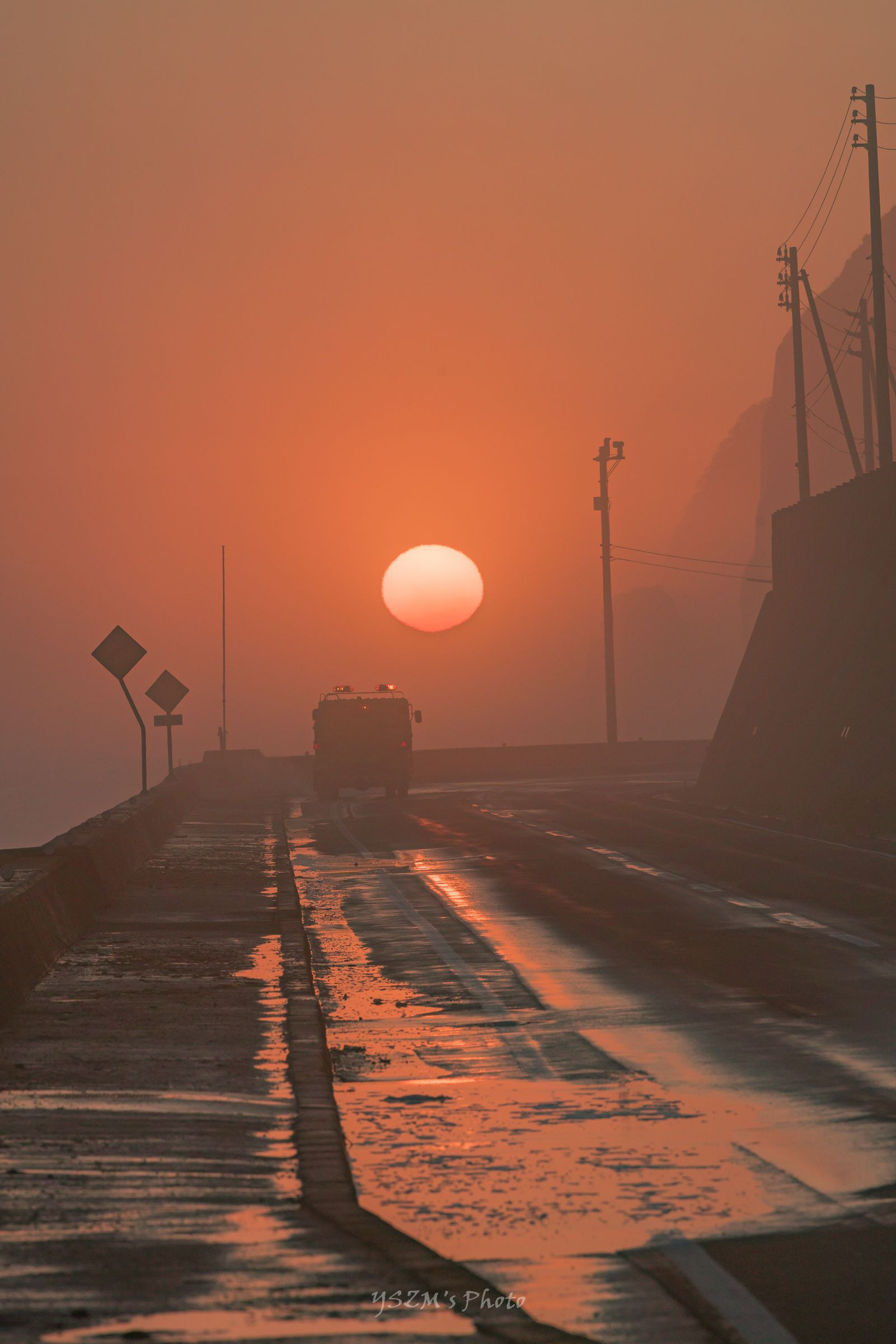波しぶきの上がる海岸線、 消えゆく太陽と消えゆく車。 ≪真実≫ 車通りが少なく、太陽が水たまりに綺麗にリフレクションしていたのだが 撮影しようと思った瞬間、こいつが通りやがったのさ~(笑) ニャロメ~~~