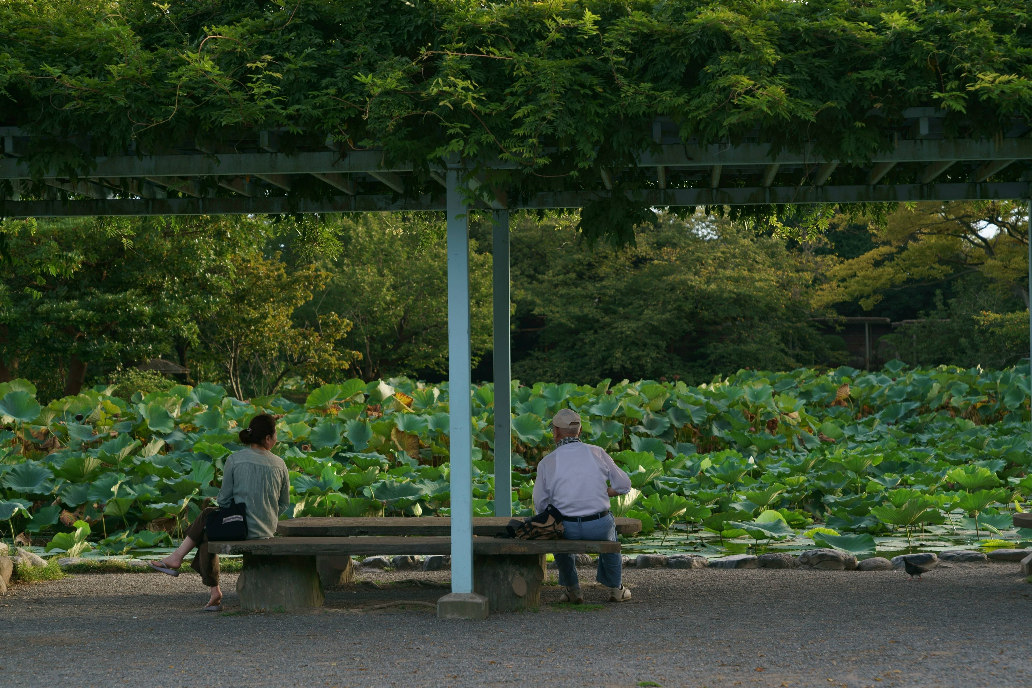 蓮の池(源平池)の前で、 黄昏前のひと時を過ごす人。 何を語ろうとしているの……… (鶴岡八幡宮にて)