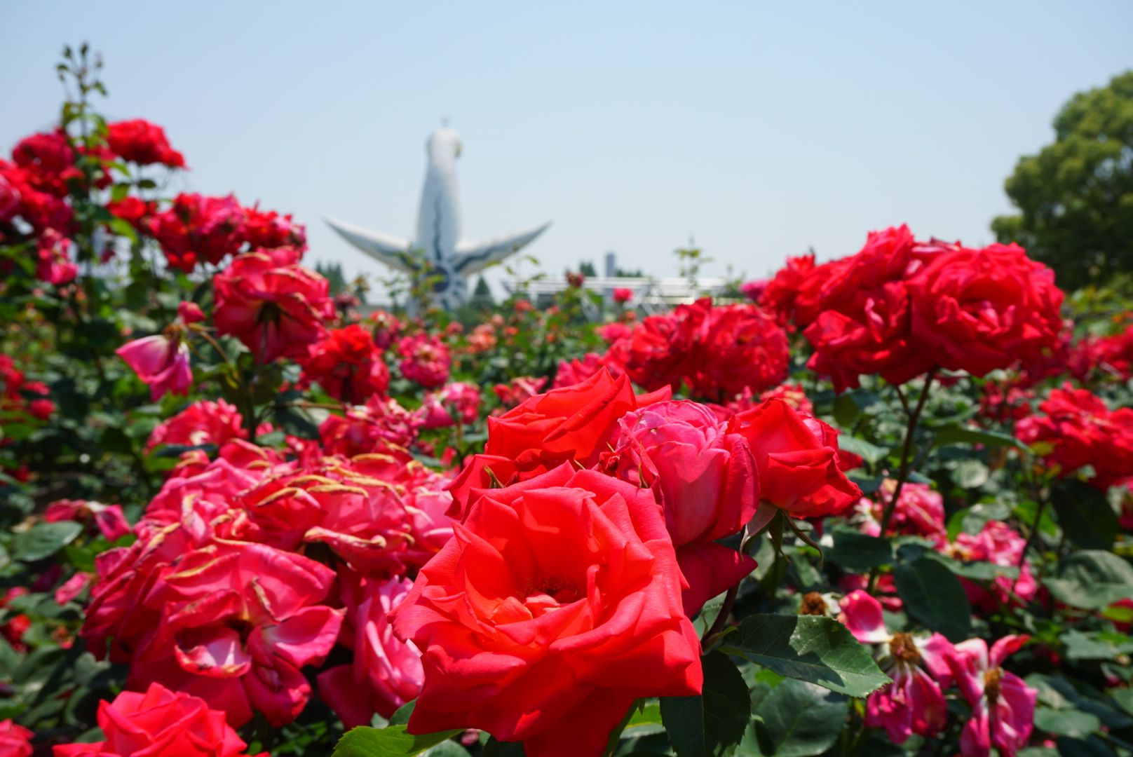 大阪万博公園で太陽の塔の背中とバラを一緒にとりました。
