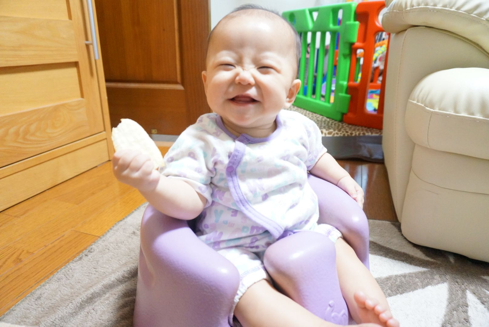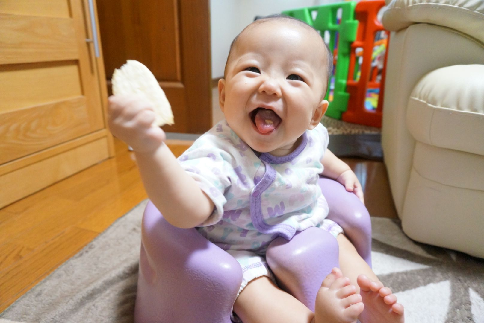 7ヶ月になって、初めておやつに挑戦しました。 ベビーせんべいです。 とても嬉しそうにご機嫌で食べてました。