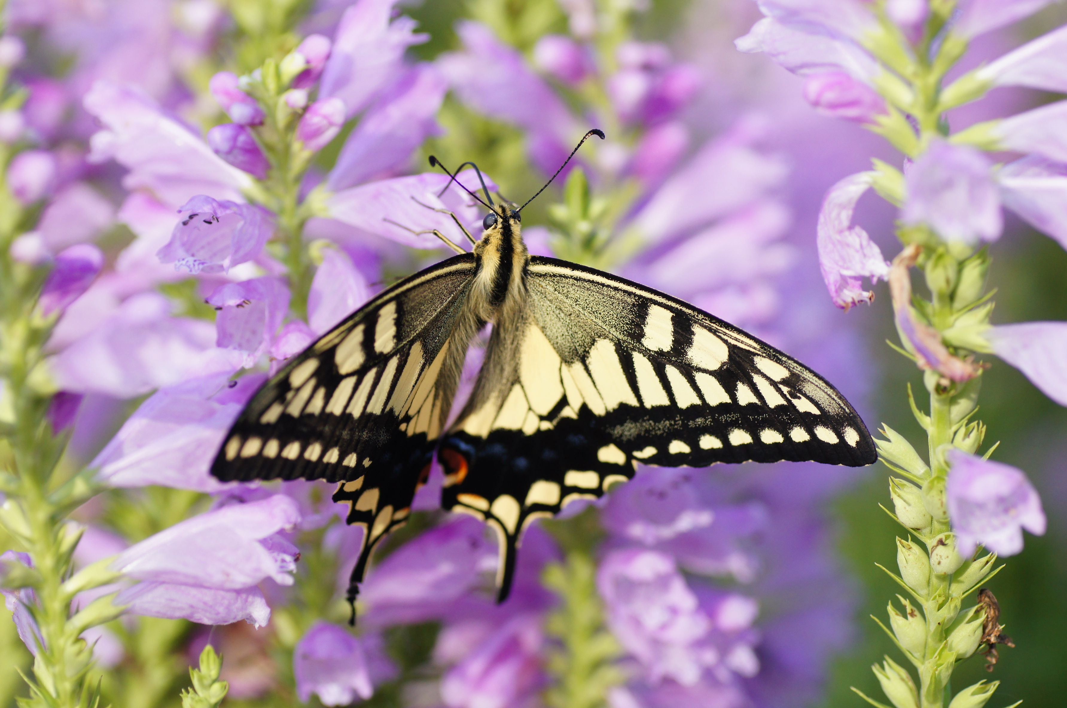 秋を迎えたキアゲハの夏型が、道路脇の花で吸蜜していました。時間を考えると夕食だったようです。