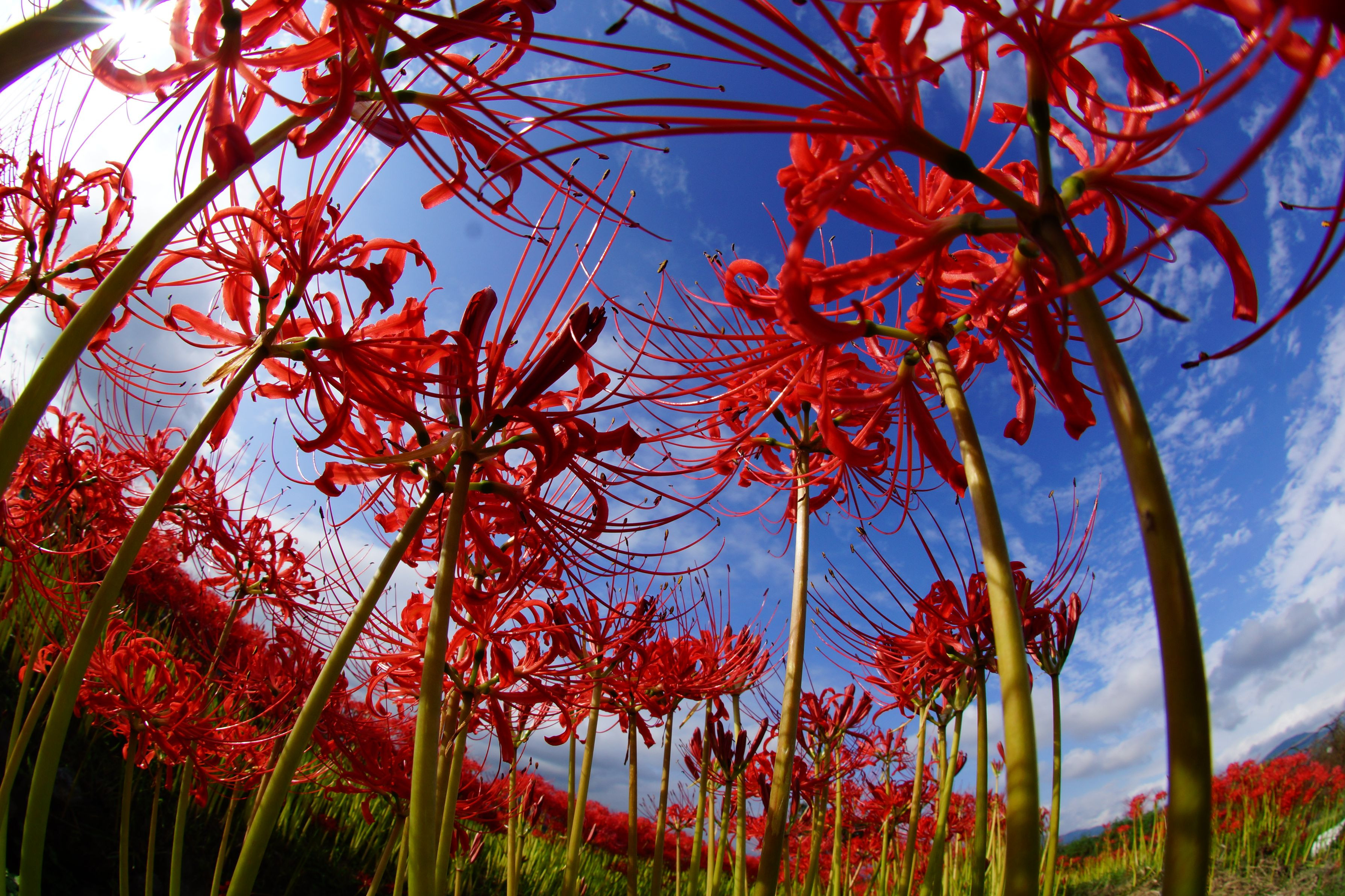 最近青空を見る機会が少なかったのですが、曇り空から見えたわずかな青空のもと、 彼岸花を撮りました。