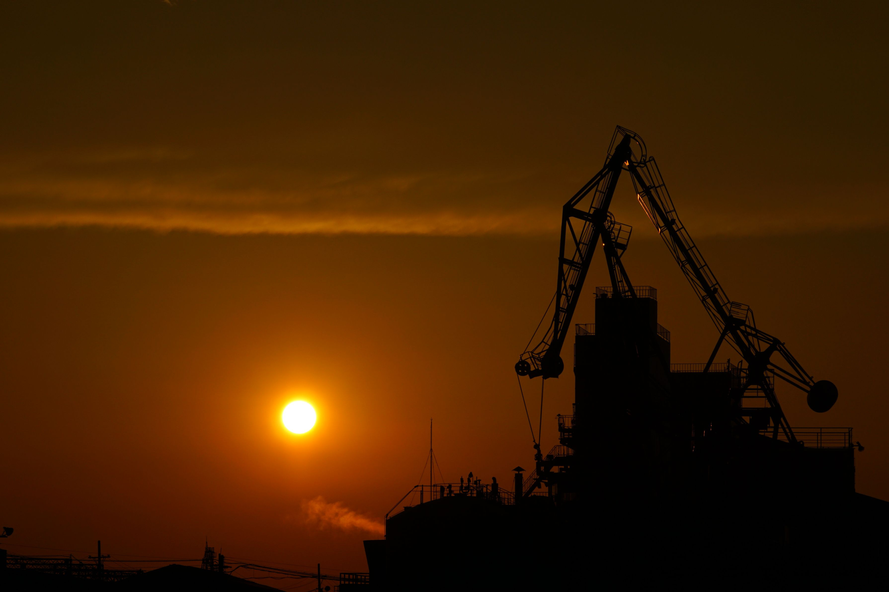 沈む夕日とクレーン またあしたも 今日と同じように ものづくりを 支えてくれるのでしょう
