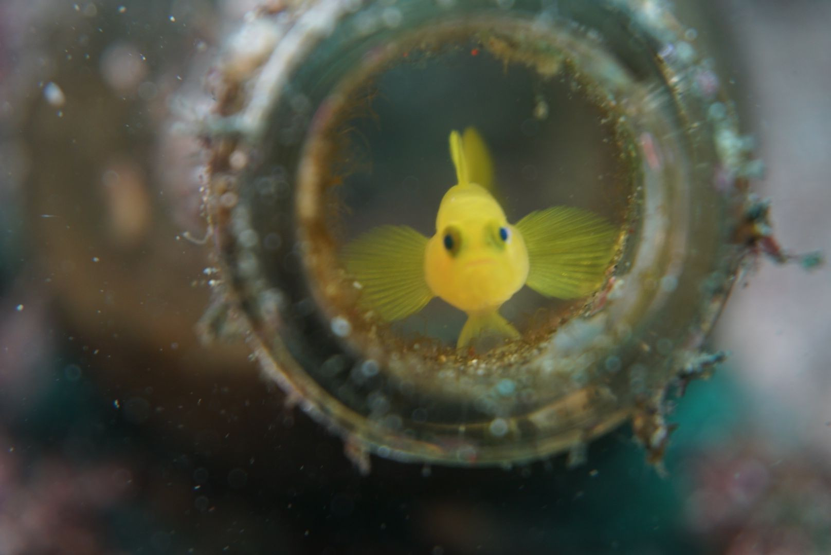 小指の爪の大きさ位のミジンベニハゼちゃんです(*≧∀≦*) 海の底の小瓶にお住まいなんです☆ 海のアイドルです(*´ω`*) クローズアップレンズ付けてパチリしました~