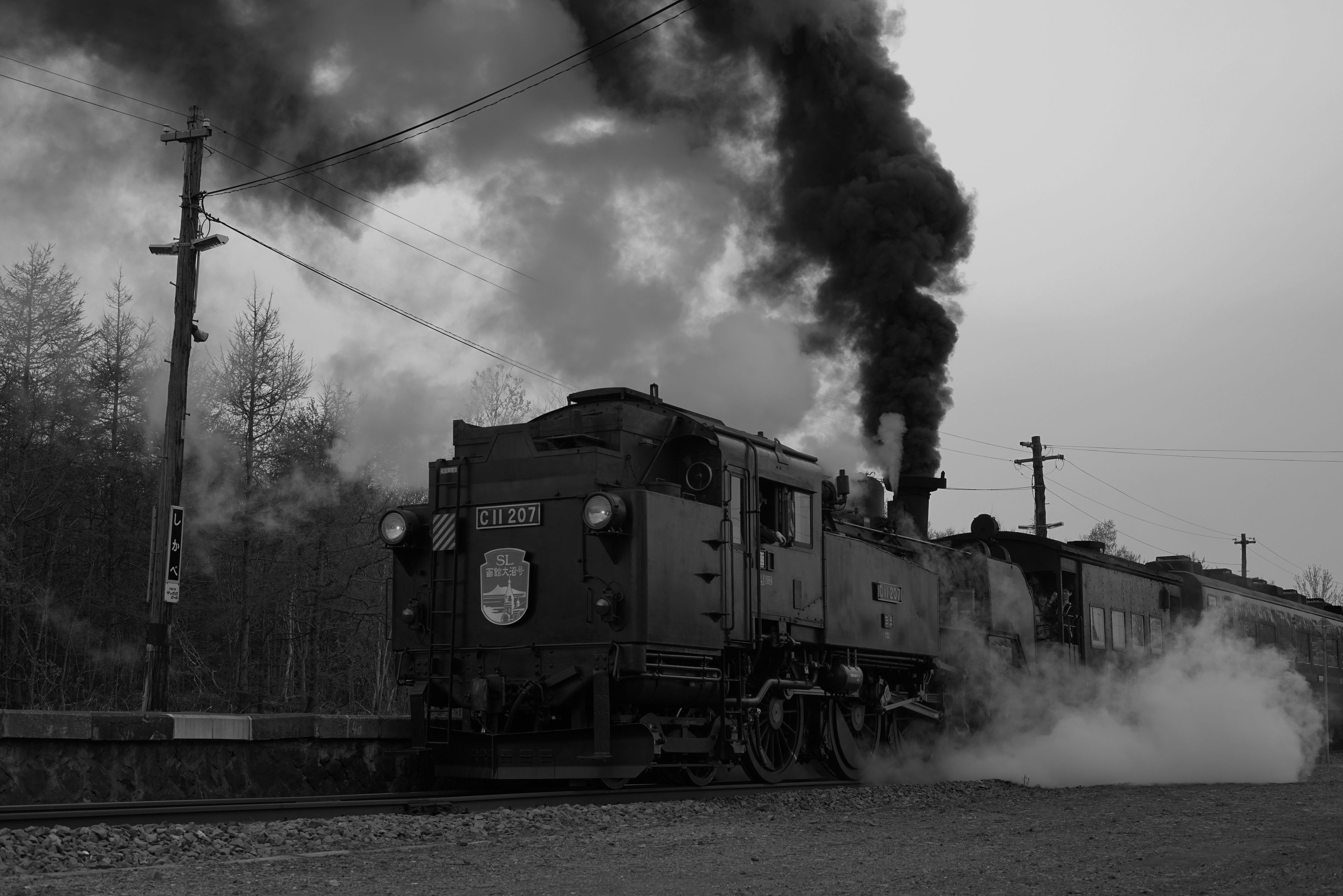 SL春の大沼号 C11 207号機の逆向き鹿部駅発車。ここはローアングルから狙えます。(もう見られません)