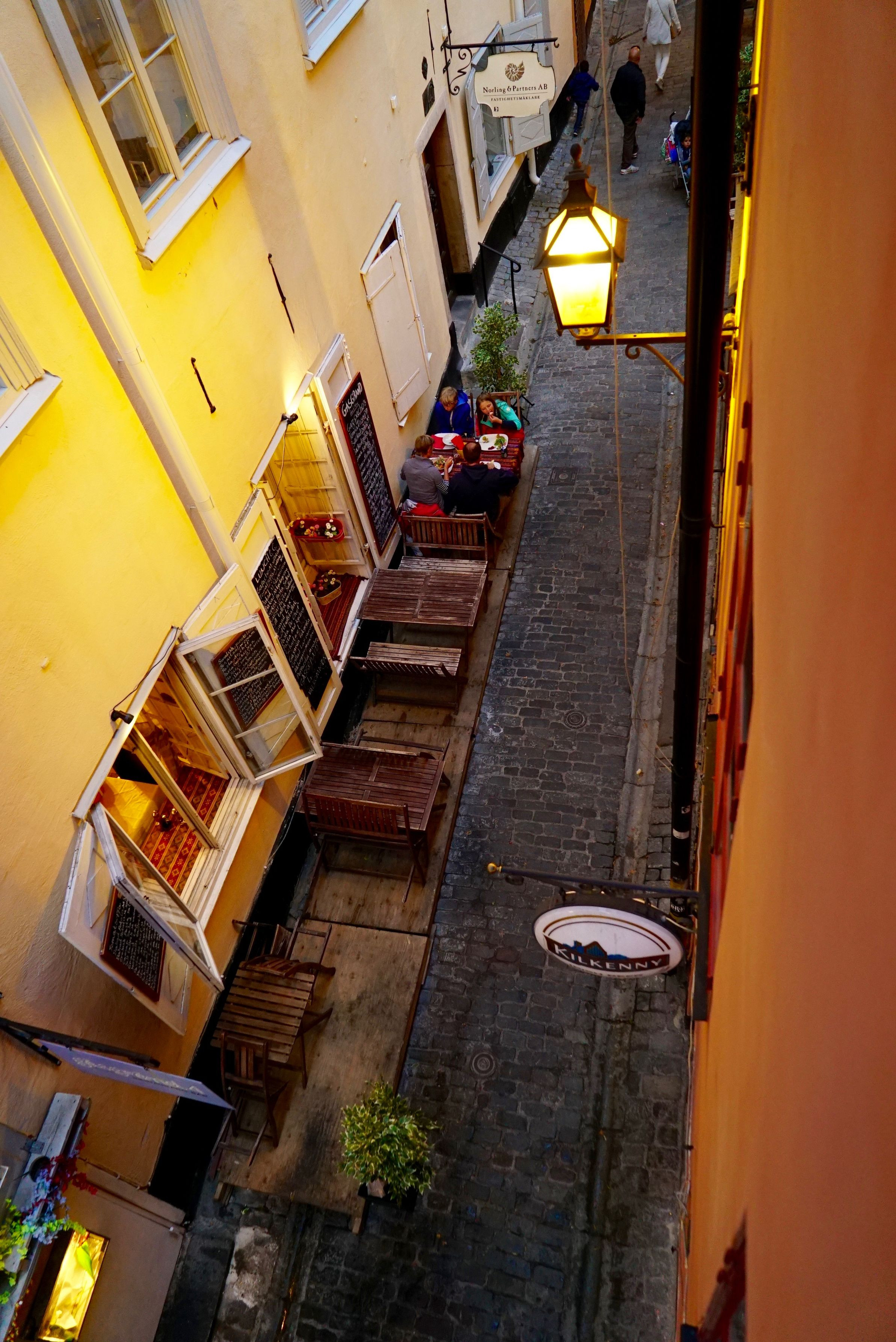 ストックホルムのホテルの窓から見下ろした路地に出ていたレストランの夕食の一コマです。