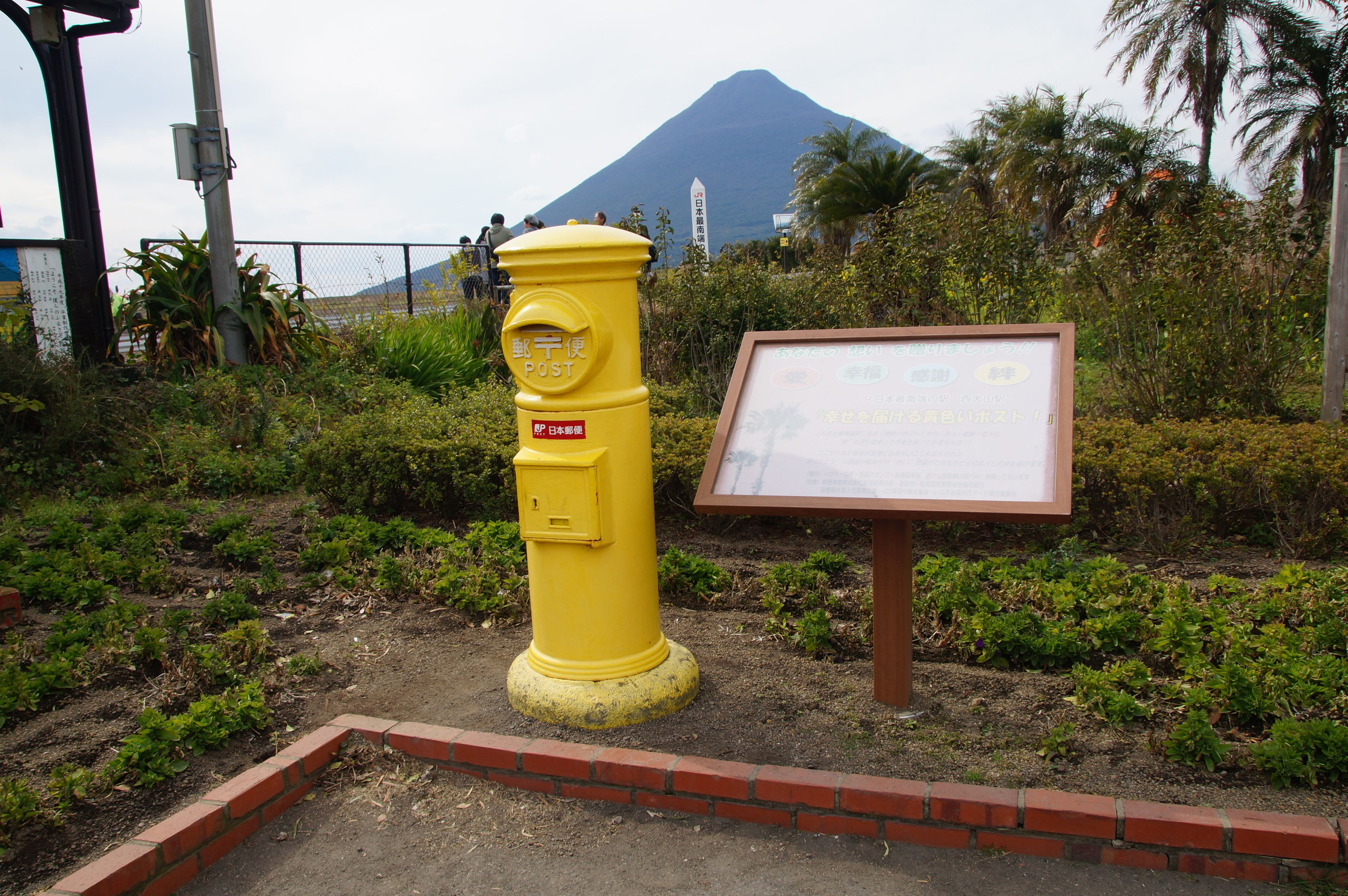 日本最南端の駅の西大山駅にある幸せを届ける黄色いポストです。 実際に投函できてこのポストから送った郵便物が届いたら幸せも届くそうです。 ここに行くなら投函するハガキを持って行きましょう!