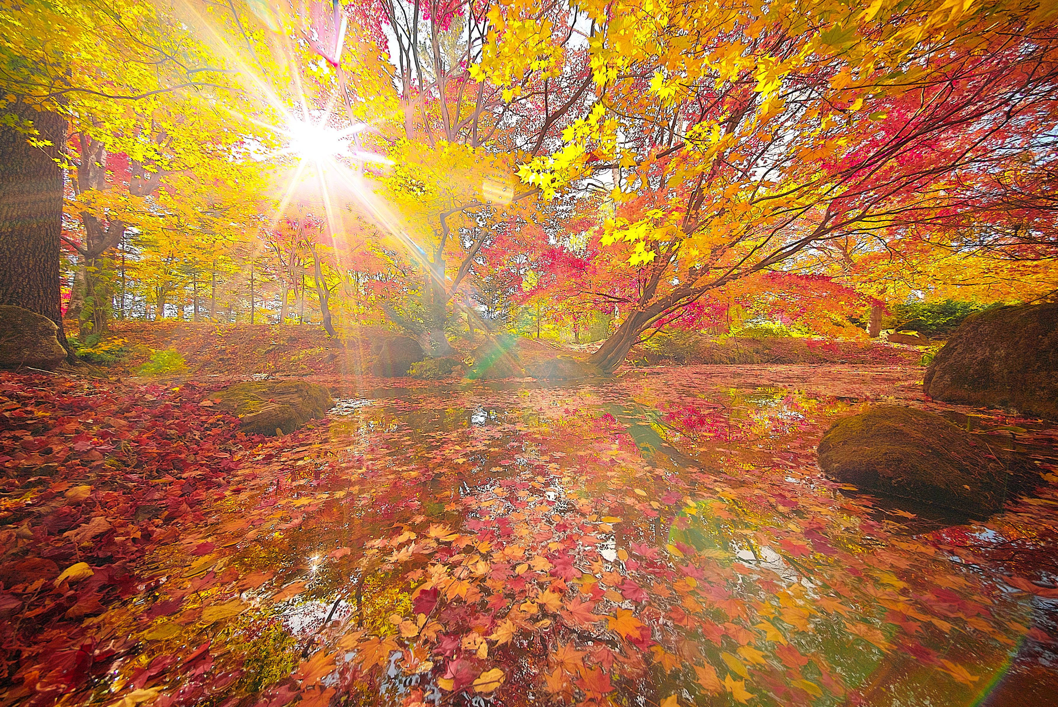 2016/10/23 眞鍋庭園にて α7S+HELIAR-HYPER WIDE 10mm F5.6 ASPHERICAL 「水辺の秋」の18秒後に撮った写真です。 この日は結構風が強くて、上空には雲が流れていたので日の差し方が目まぐるしく変わっていました。ちょっとのタイミングの違いで随分と雰囲気の違う写真になりました。