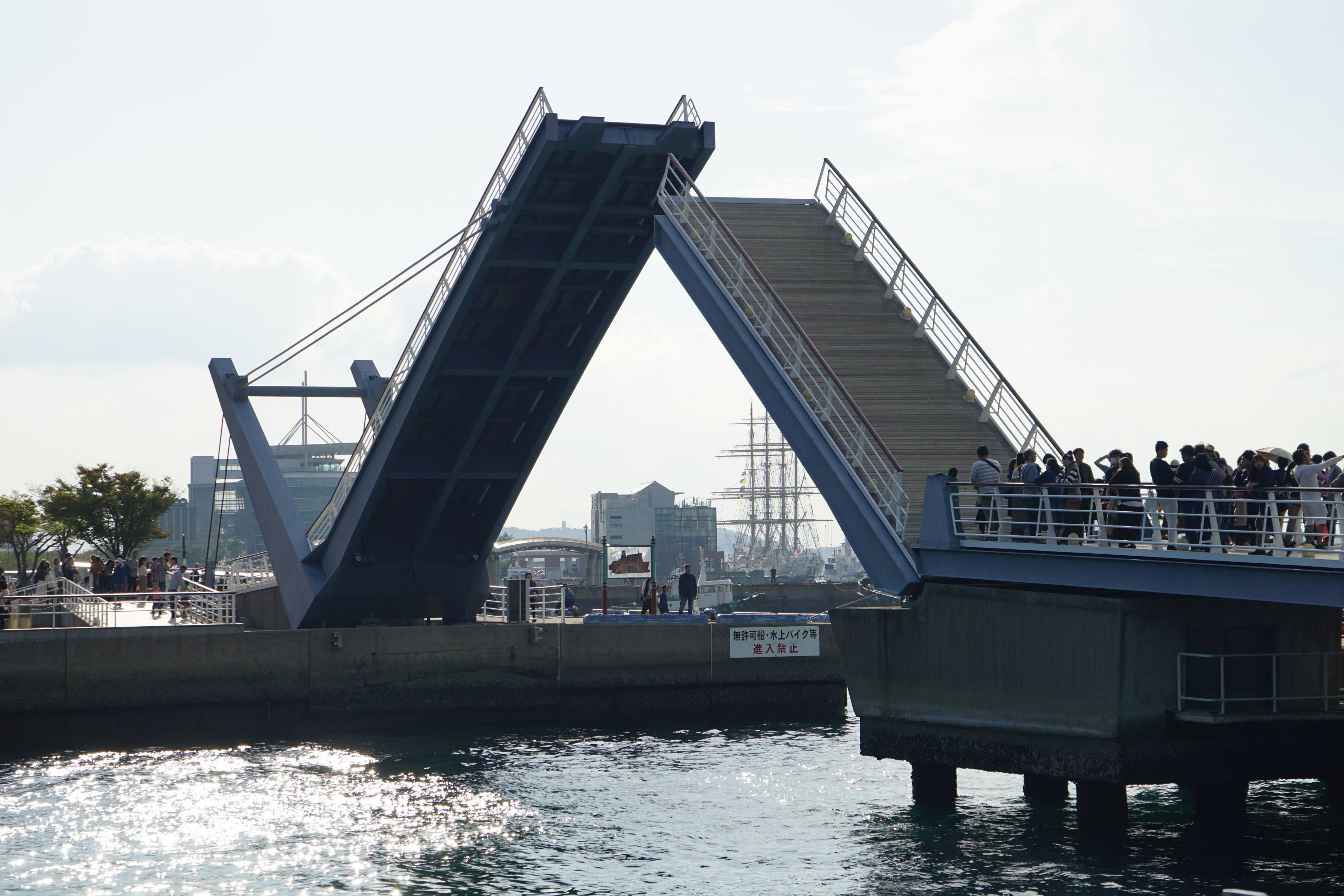 門司港にある、ブルーウイングもじ。これから閉じようとしています。 奥に見えるマストは「海王丸」
