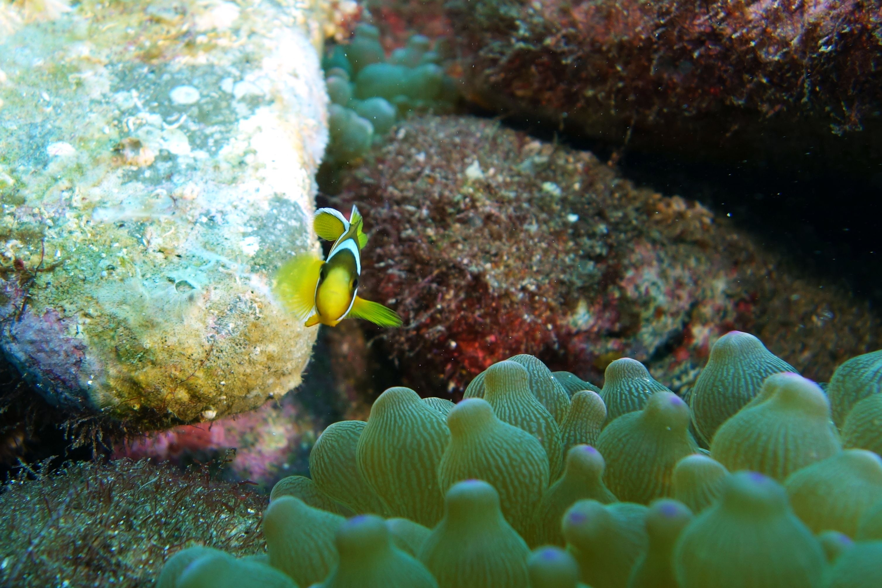 静岡県大瀬崎 10月30日撮影 先日、クマノミの産卵を投稿しましたが、あれから2ヶ月たった先日の日曜日、同じポイントへ潜った際、小さなクマノミを発見! 同じ卵じゃないにしても、無事生まれたのかな(^^) なんだかちょっとうれしくなりました。 正面向いた写真しか撮ってなかったので、いまいち分かりにくいかもですがw