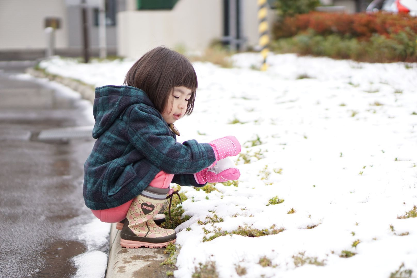 札幌。初めての雪。寒い中一生懸命雪だるま作ってます。